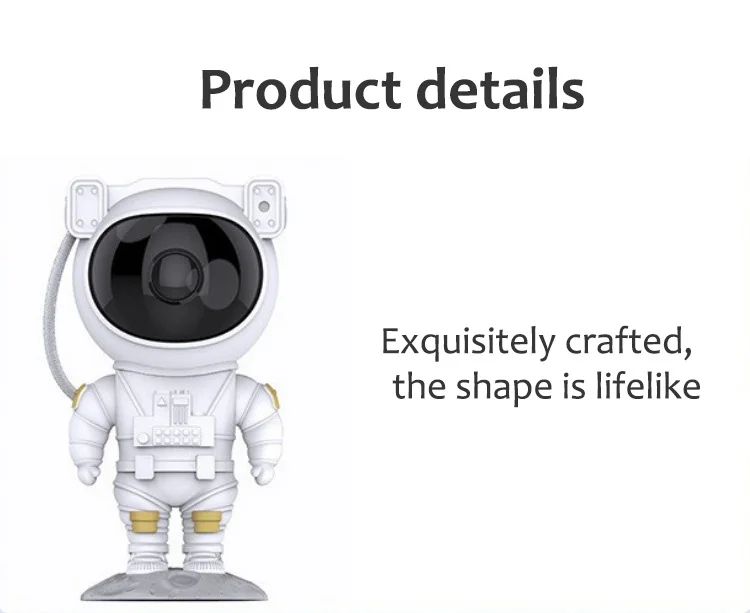Информация о продукте* Дизайн космонавта* 360 ° свободная регулировка* Проекция звездного неба и проекция Галактики* Конструкция основания лунной поверхности