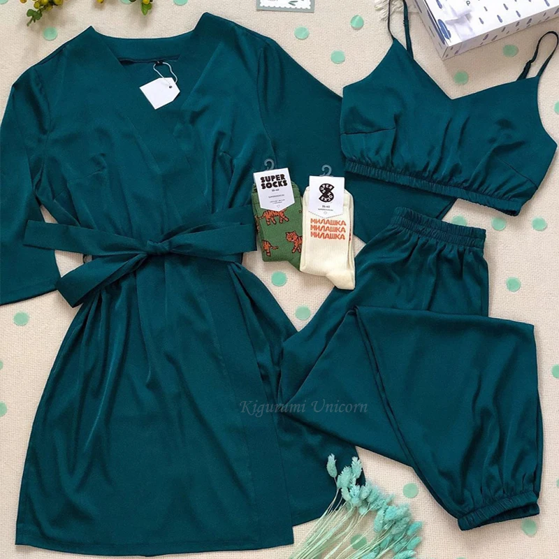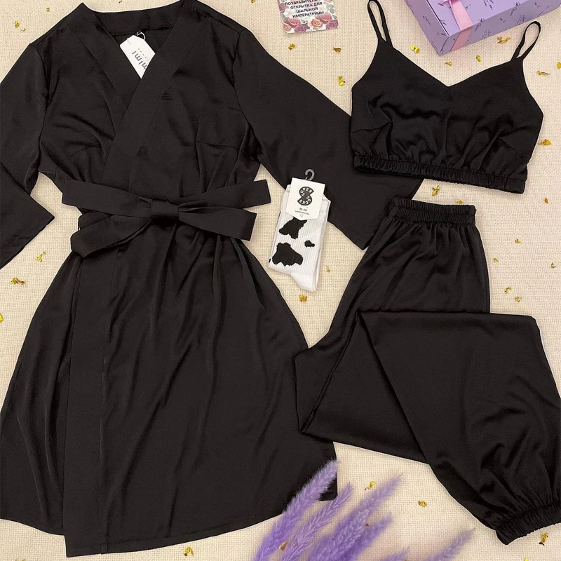 Женский атласный Шелковый пижамный комплект из трех предметов, топ ...