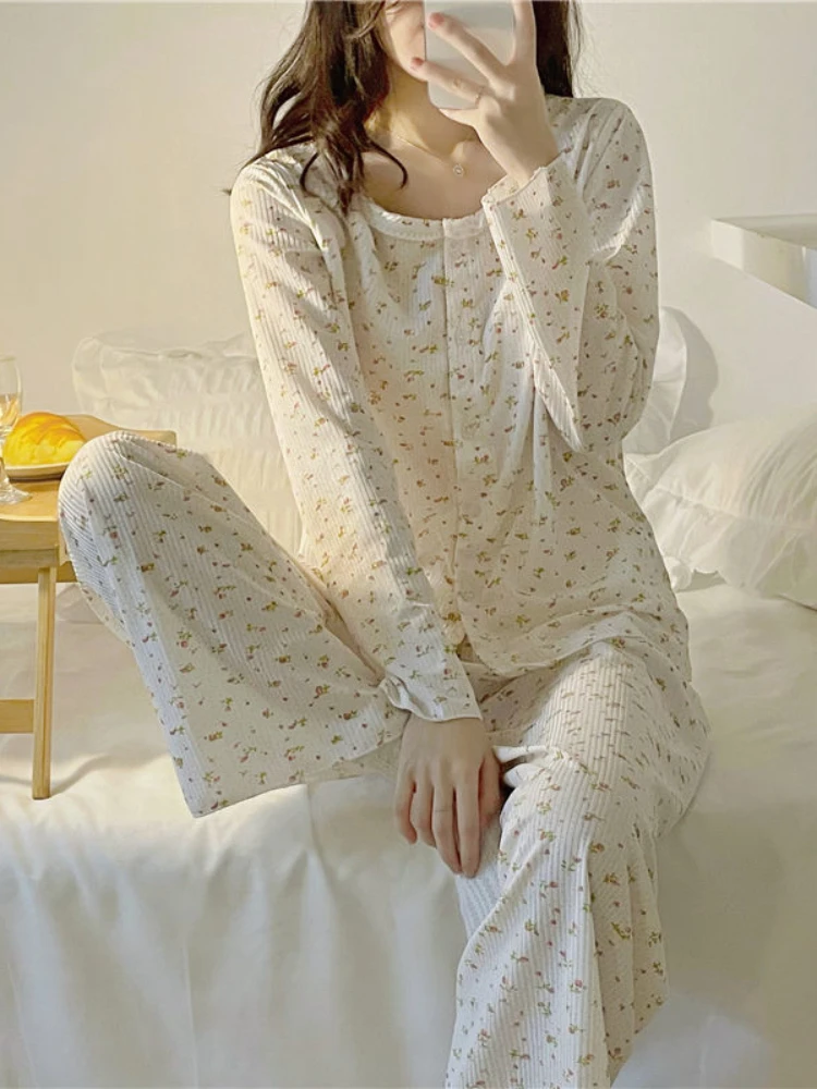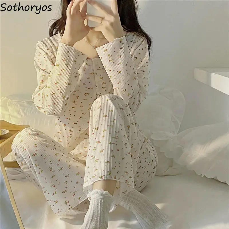 Мягкие пижамные комплекты, женские топы с круглым вырезом, длинные брюки, милая одежда для сна с цветочным рисунком для подростков, уютная свободная дышащая шикарная Женская одежда для отдыха