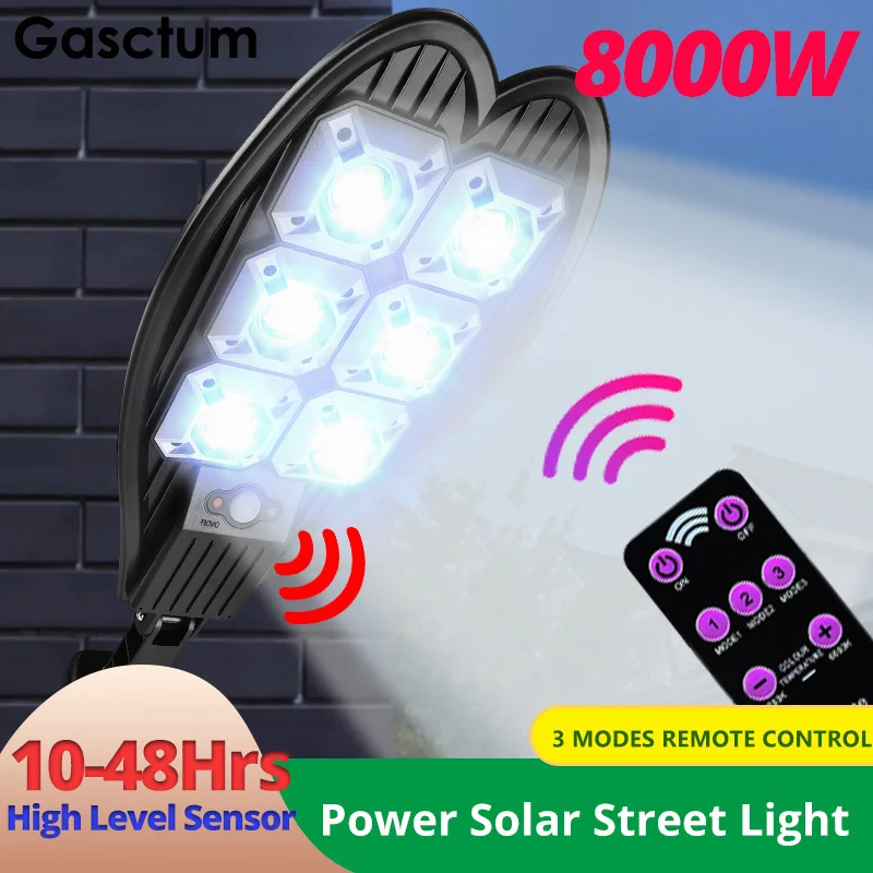Уличный светильник на солнечной батарее, 8000 Вт, водонепроницаемый садовый светильник с датчиком движения и дистанционным управлением