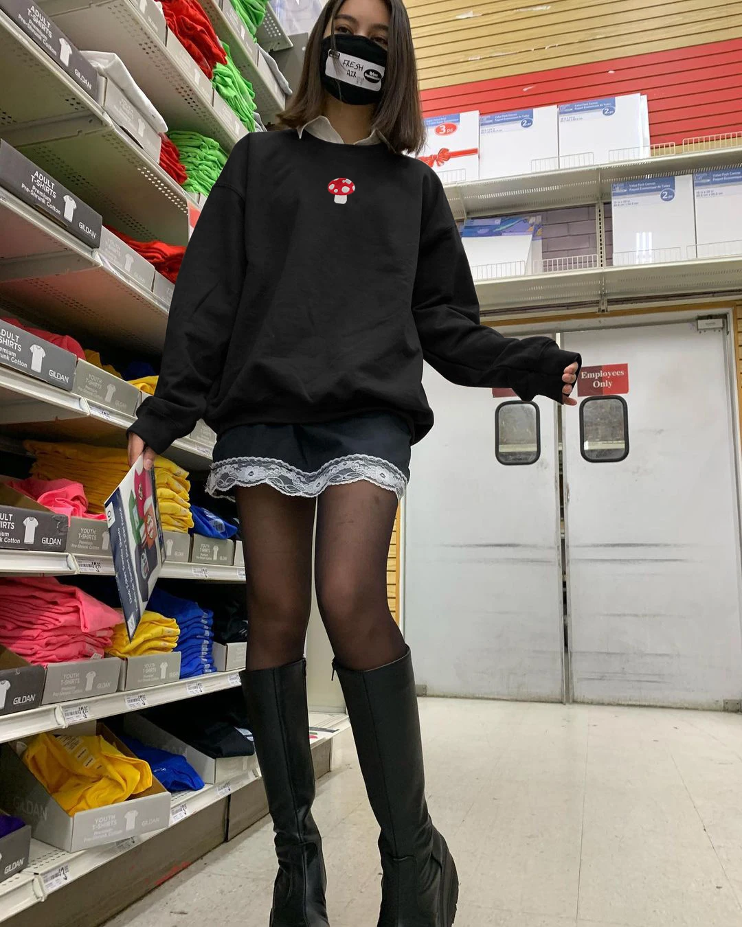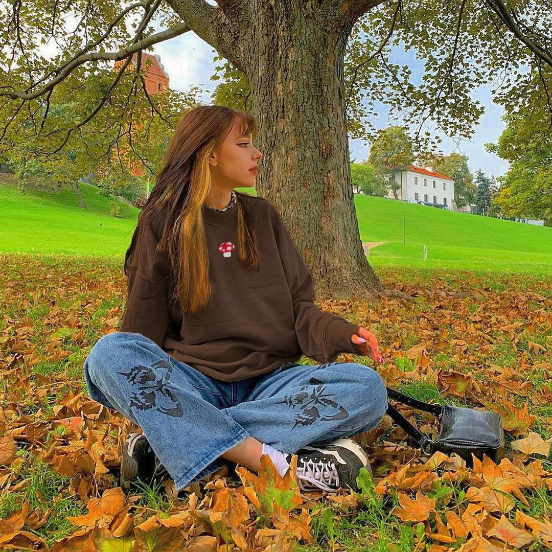 Свитшот с вышивкой в виде грибов в стиле Харадзюку, с круглым вырезом, зимние толстовки большого размера Y2K, корейский стиль, свободное платье для пар, рубашка с длинным рукавом