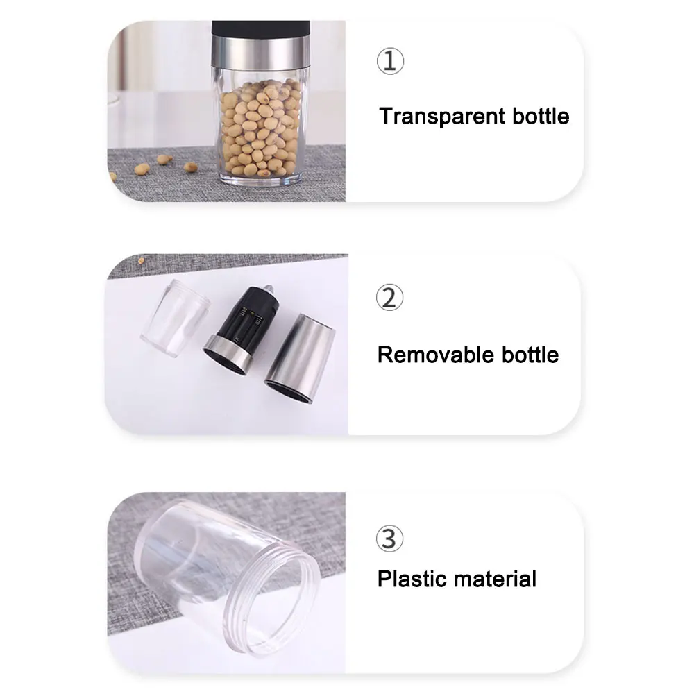 3. Электрическая шлифовальная машина подходит для приправ из твердого зерна, таких как перец и соль. Питание от аккумулятора, удобно и быстро, использовать в любое время и в любом месте. Эта шлифовальная машина является хорошим помощником для кухонь, ресторанов, вечеринок и пикников на открытом воздухе.