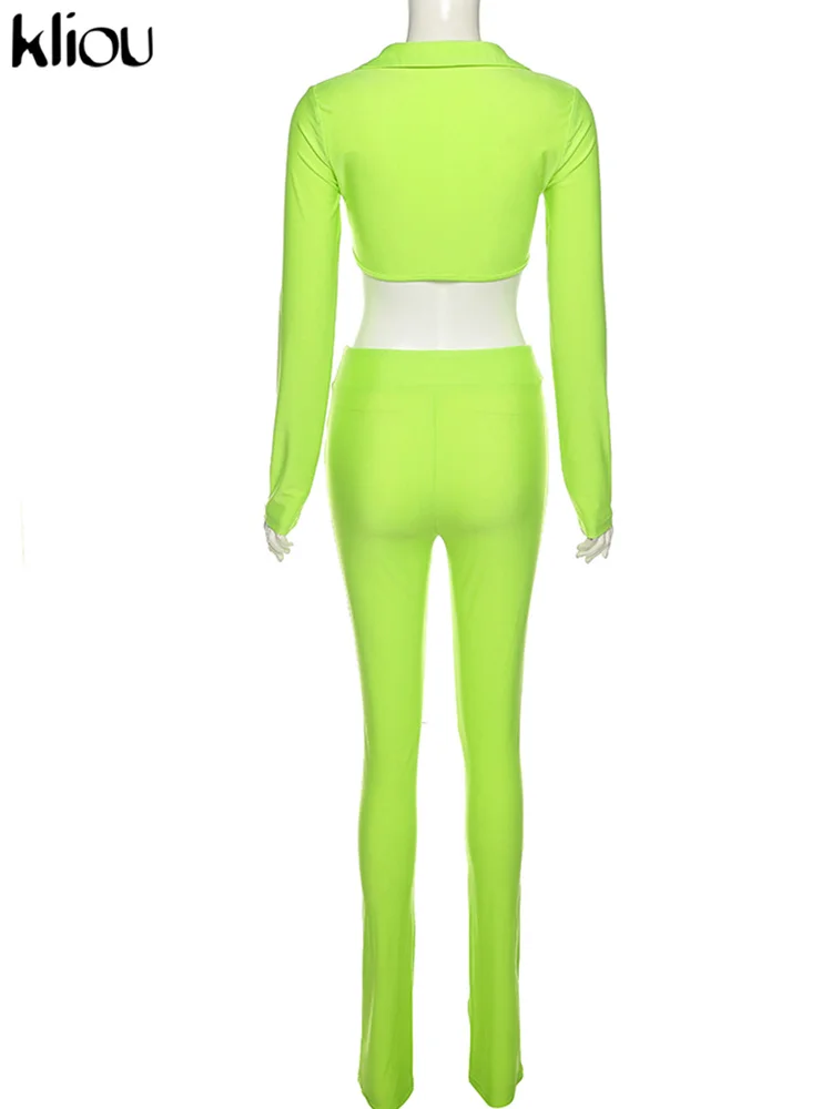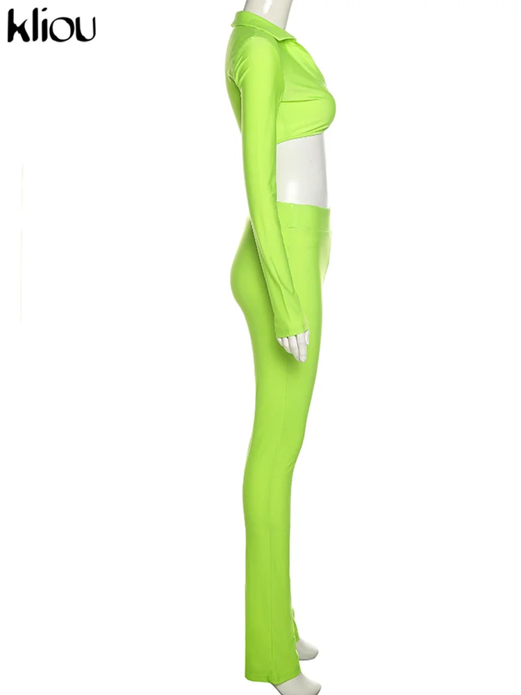 Женский Повседневный комплект из двух предметов Kliou, Осенний популярный топ с длинными рукавами и воротником поло + облегающие спортивные брюки для активного отдыха