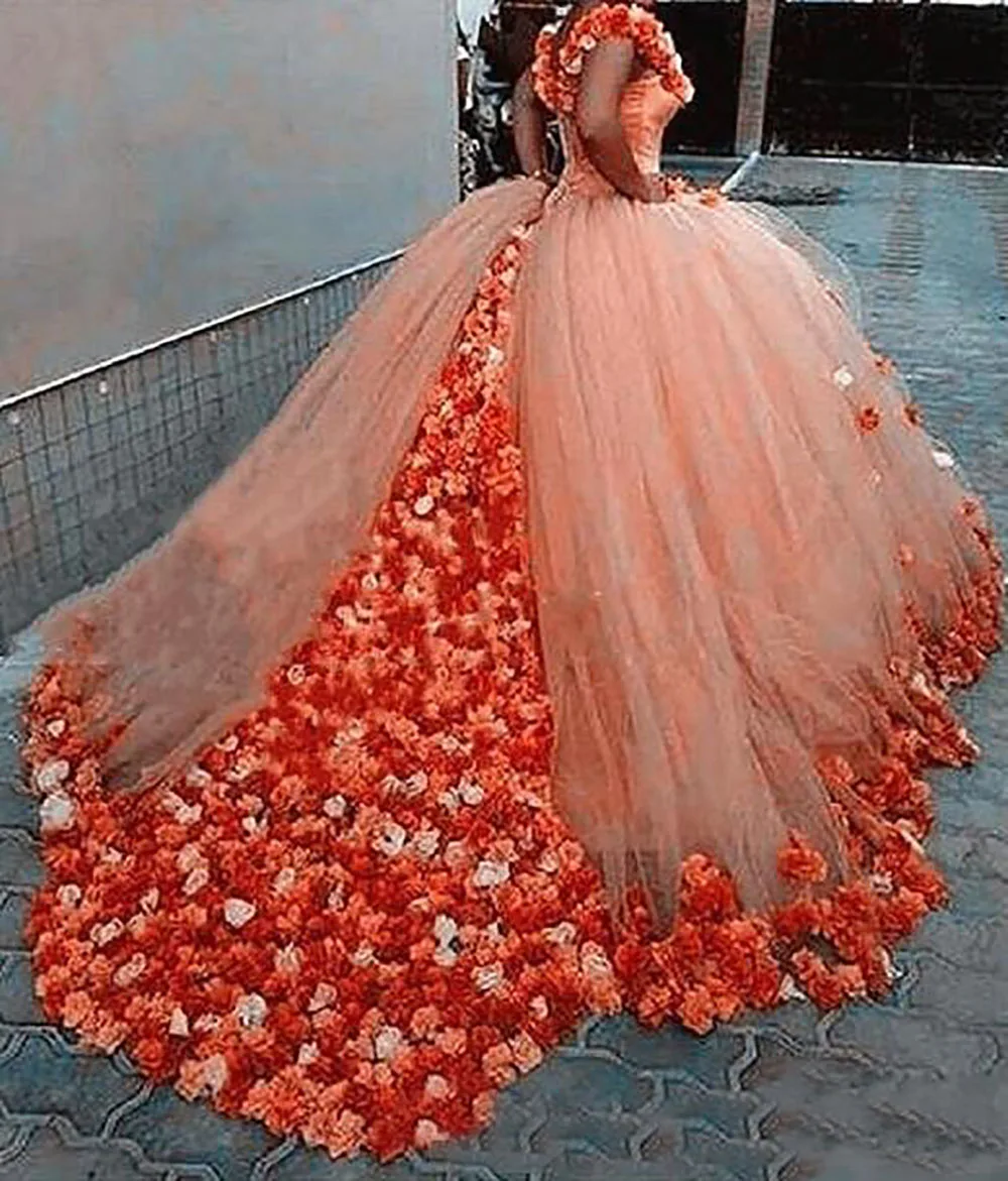 Женское платье с открытыми плечами, пышное бальное платье из тюля с 3D цветами розы, оранжевое платье со шлейфом, для вечеринки в честь Дня рождения, 16