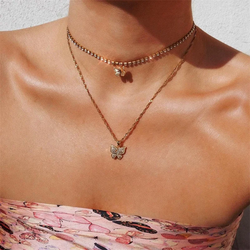 Подвеска-бабочка женская, золотая цепочка многослойная, цепочка-чок...