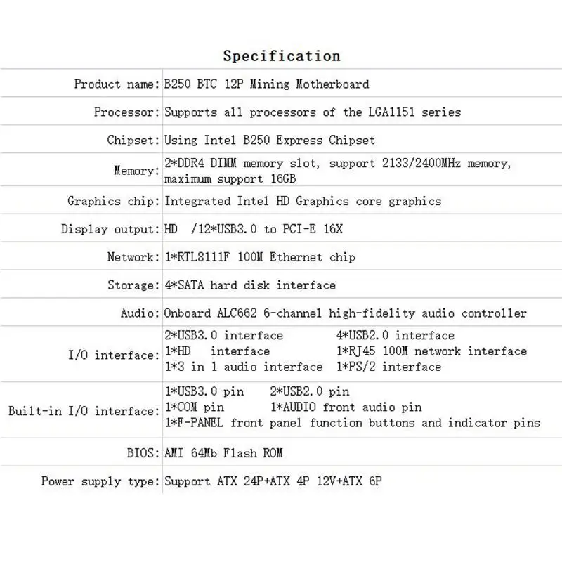 Материнская плата B250 BTC для майнинга Lga 1151, поддержка 12 PCI-...