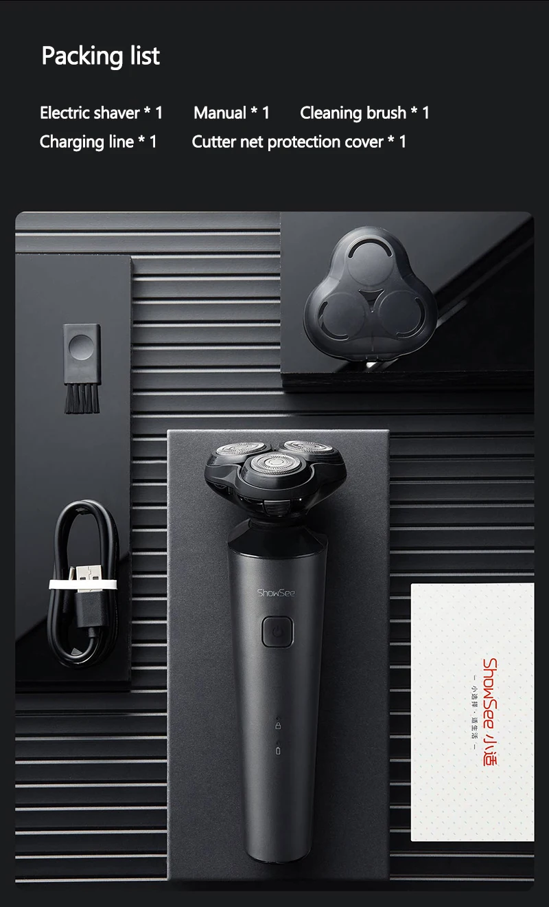 Характеристики:Модель изделия: F303-BKЦвет изделия: черныйВес нетто: 162 гРазмер изделия: 166*55*25 ммНапряжение зарядки: 5 ВТок зарядки: 1AЕмкость аккумулятора: 600 мАчВходная мощность: 5 ВтИсполнительный стандарт: GB4706.12005 GB4706.9-2008Особенности:* Трехголовная плавающая бритва, адаптируется ко всем видам контура лица, бритье более чистое* Прецизионная сталь, износостойкая, прочная, мягкая на ощупь* IPX7 водонепроницаемый, моющийся и легко чистится* Сухое и влажное бритье, простота в использовании* Зарядка Type-C, 1 час зарядки, 30 дней вождения* Режущая головка может быть разобрана, и очистка более удобна* Низкий уровень шума, шумоподавление и амортизацияShowsee электробритва:Чистое бритье, удобный опытКавасаки сталь | Независимая плавающая 3 три режущая головка |Высокая мощность | Сухое и влажное двойное Бритье