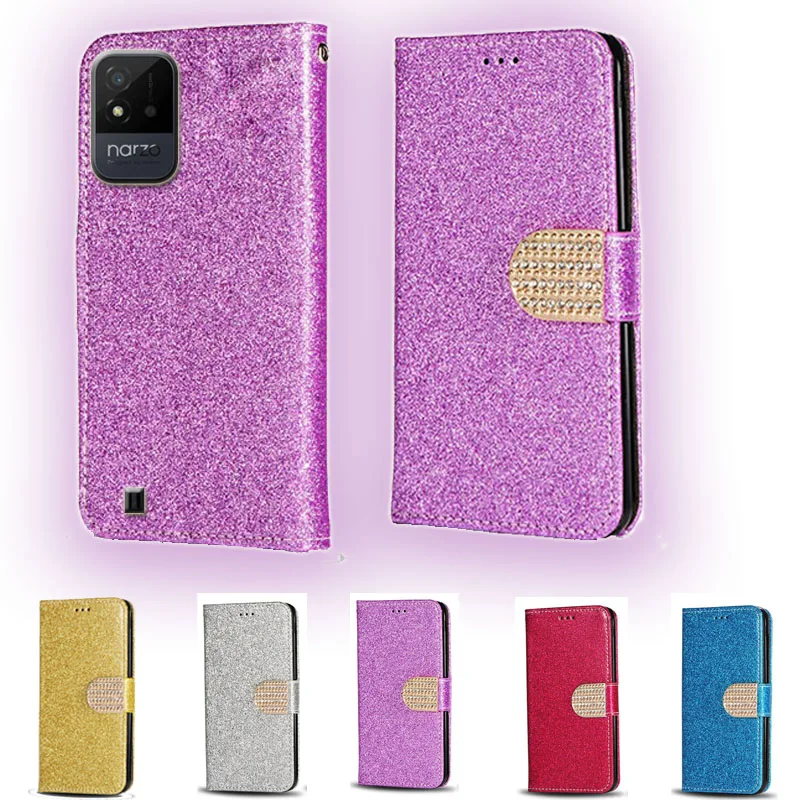 Роскошный блестящий кожаный чехол-кошелек с откидной крышкой и бриллиантами для телефона Oppo Realme Narzo 50i с функцией подставки и отделением для карт