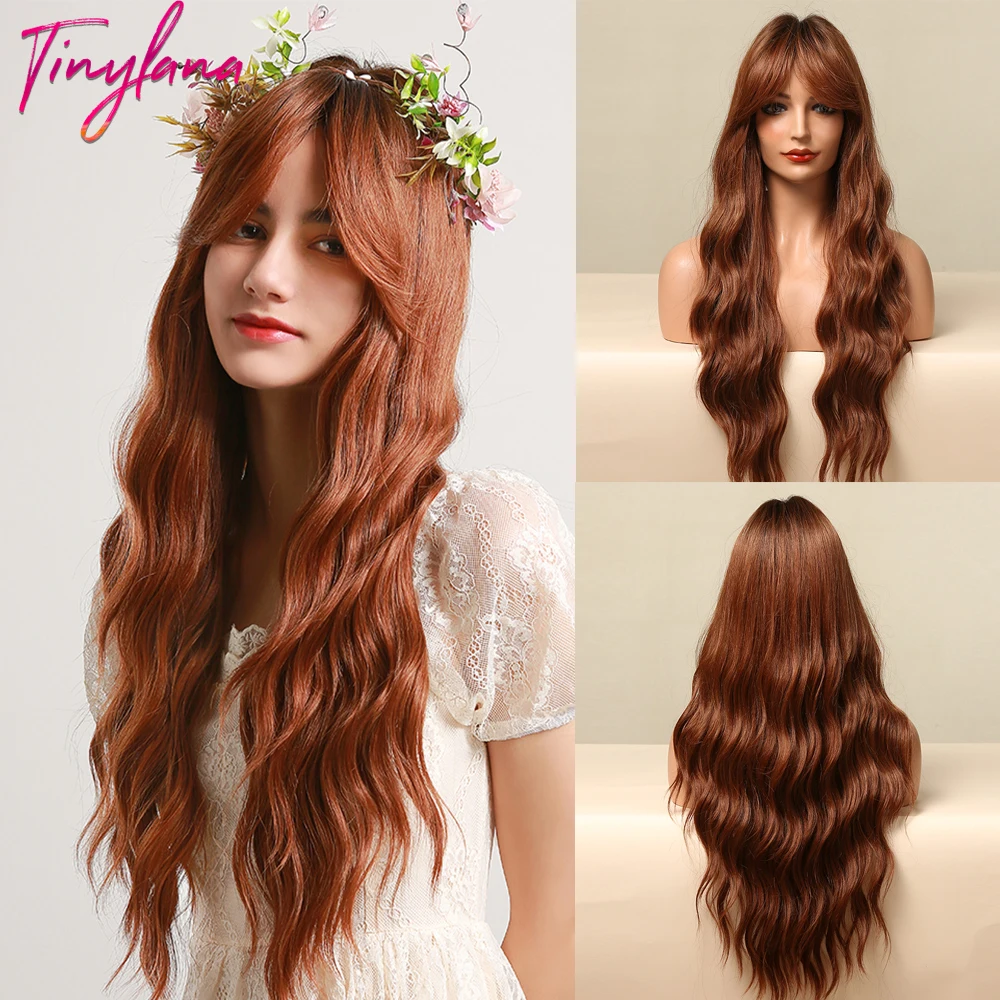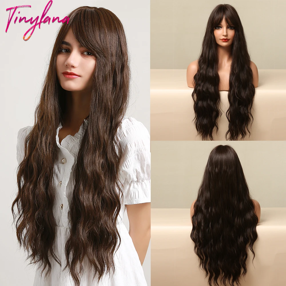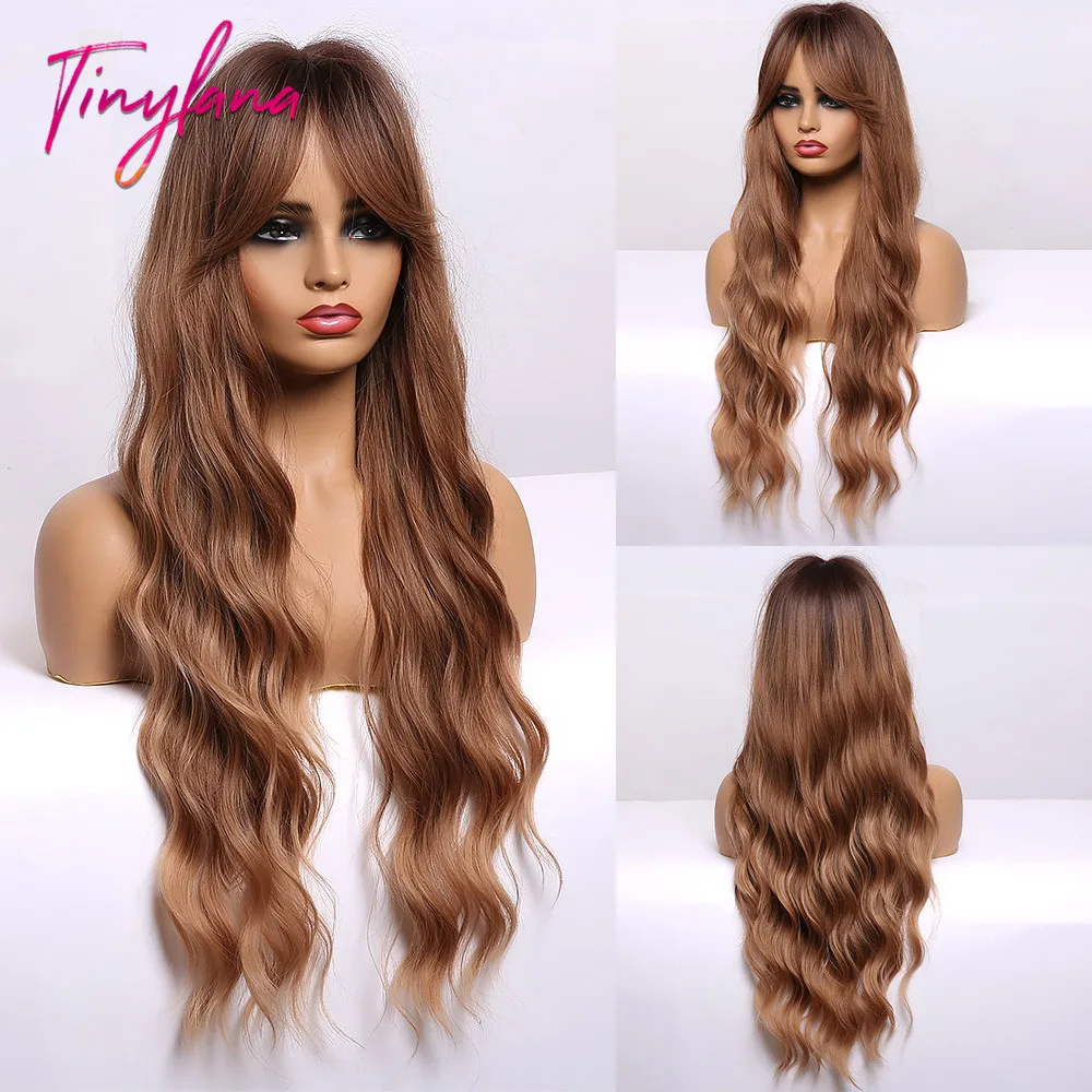 Длинные коричневые волнистые синтетические парики с челкой henmargu...