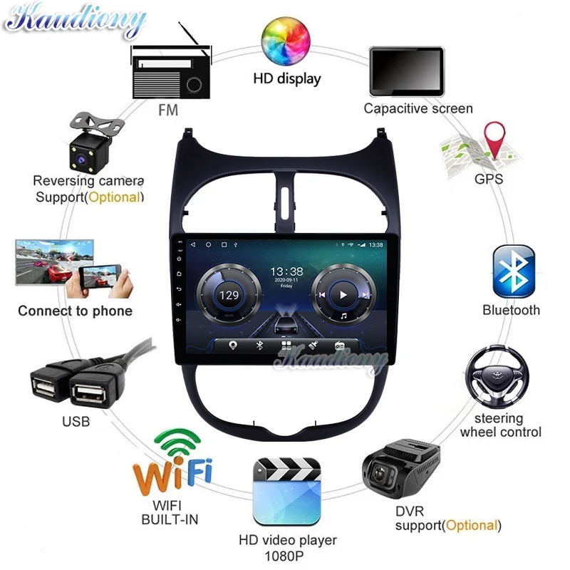 Автомобильный DVD-плеер Kaudiony, мультимедийный плеер 9 дюймов на Android 11 для Peugeot 206, автомобильное радио, GPS-навигация, DSP 4G стерео BT 2000-2016