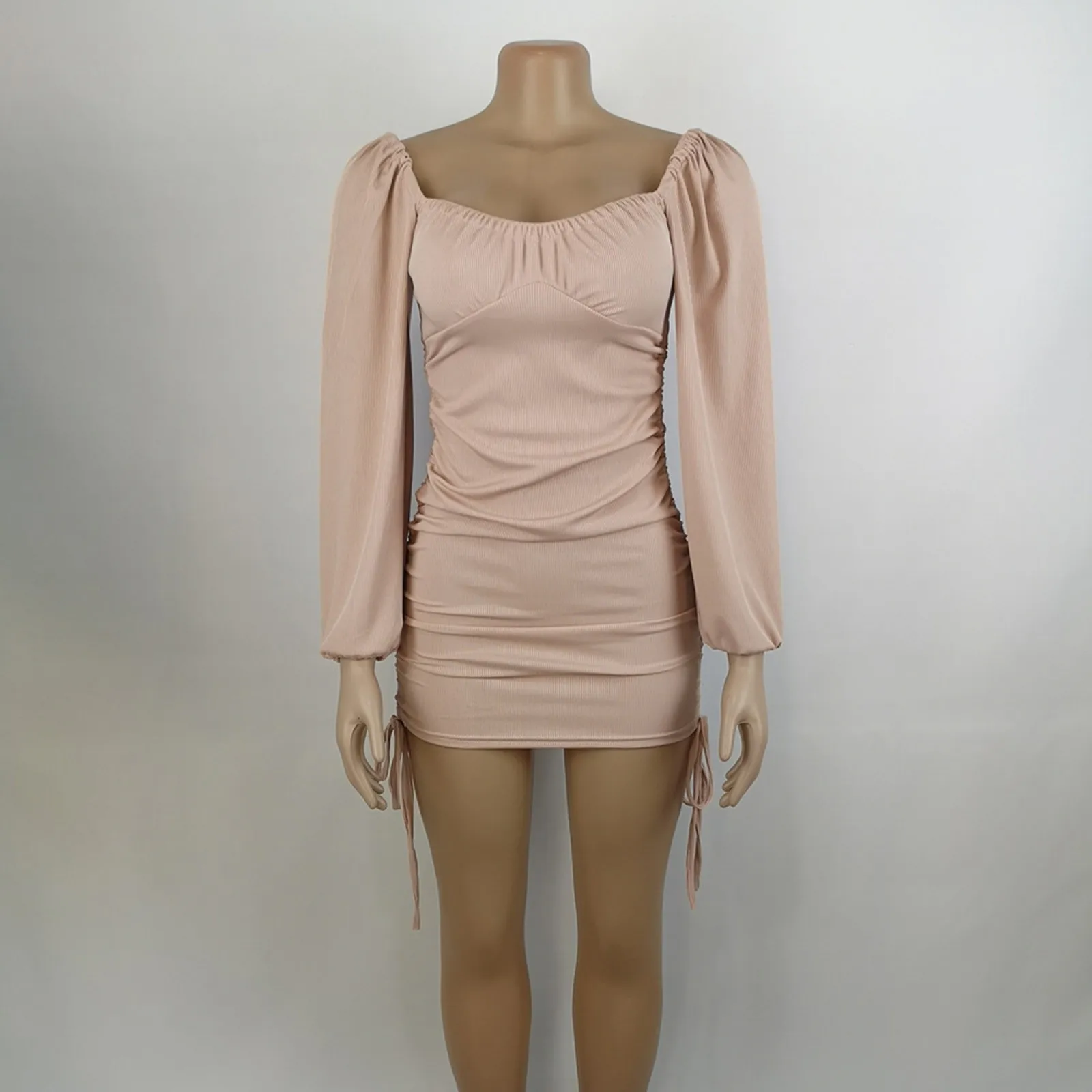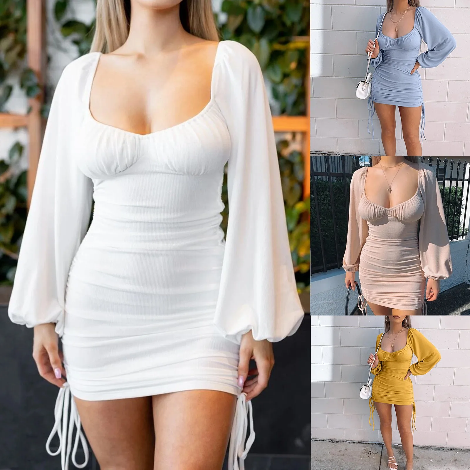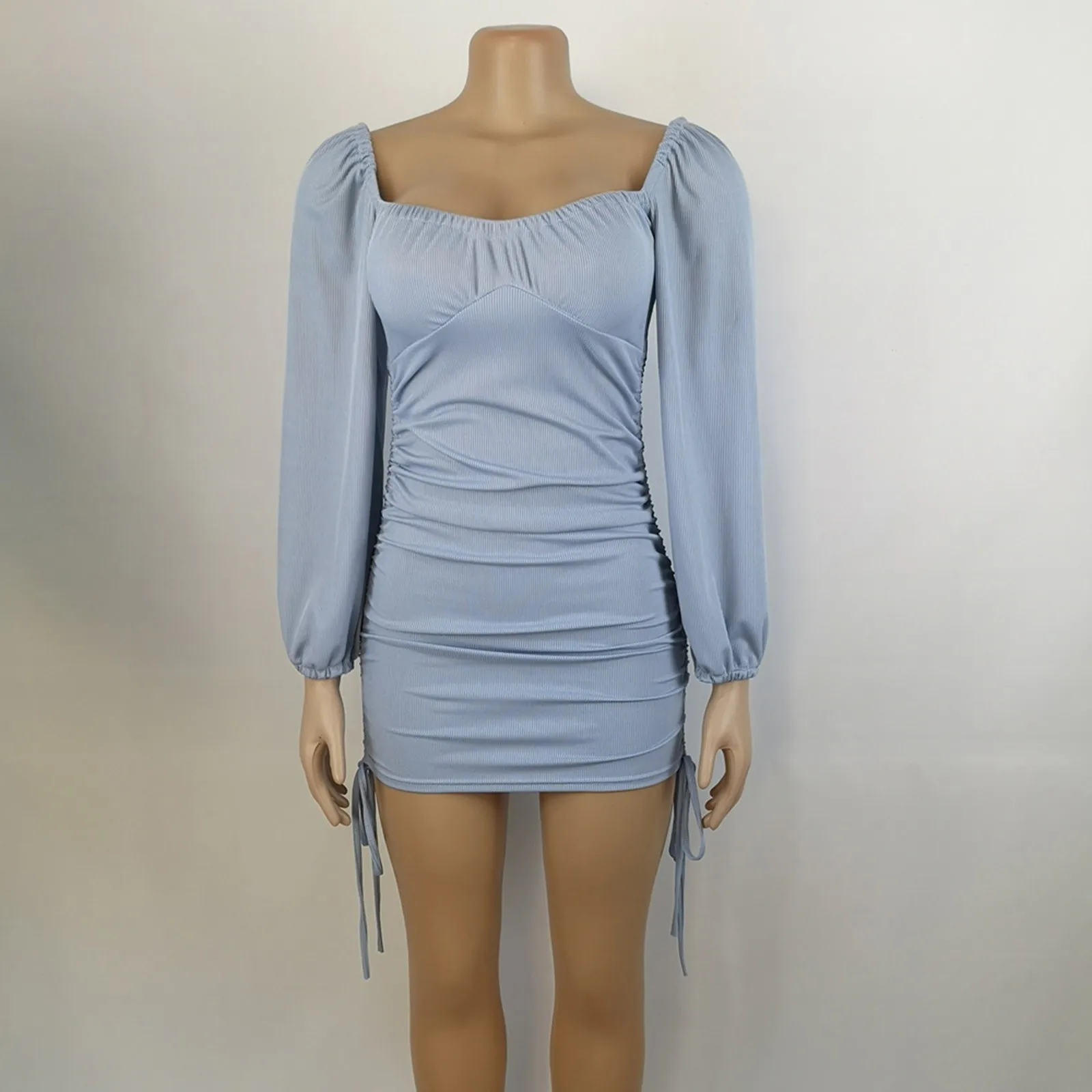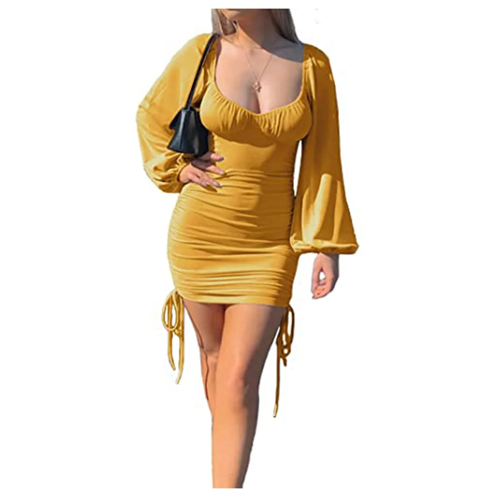Особенности:Застежка на шнурке,Пышное Платье с длинными рукавами, низким квадратным вырезом, выше колена, со сборками по бокам, короткое платье с высокой талией, клубное мини-платье с рюшами спереди