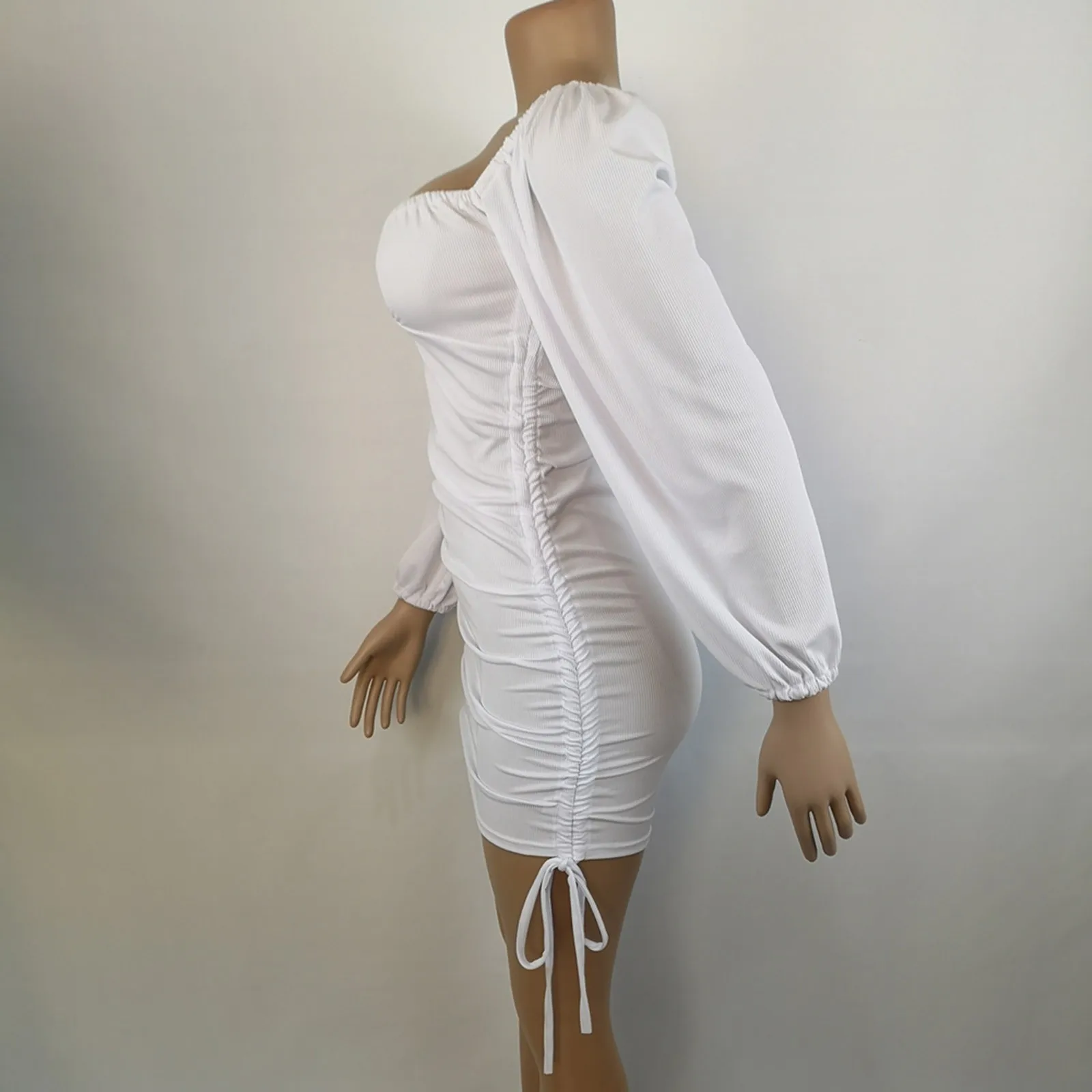 Элегантные женские белые платья-фонарики с длинным рукавом, уличная одежда, однотонное мини-платье в рубчик с рюшами и кулиской для вечерние, Vestido Mujer