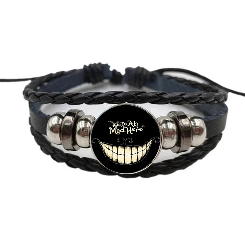 Черный классический кожаный браслет, модный круглый значок Алиса в стране чудес, браслет с Чеширским котом, подставка, лучший подарок, браслет