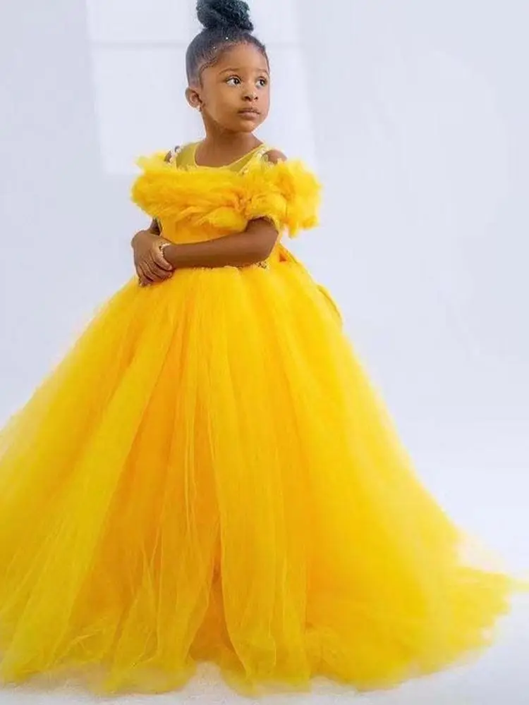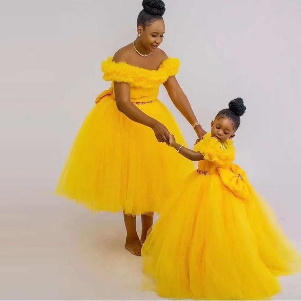 Желтые пышные платья для маленьких детей на день рождения, платье с драгоценным вырезом и оборками для мамы и девочки, платье принцессы с цветами для девочек, детское платье