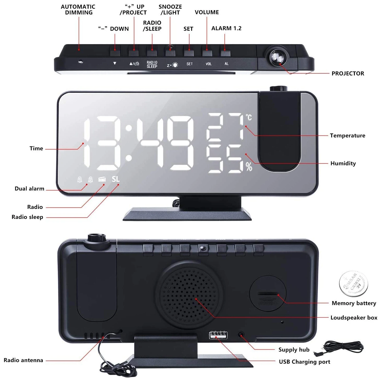 Будильник с проекцией времени:Большой светодиодный цифровой дисплей: время, влажность и температура могут быть легко читаются.Функция проекции: время проекта, регулируемый фокус, 3-уровня яркость проекции, можете вращать проекции 180 °.Автоматический светильник-Регулировка: в этом режиме яркость проекции не может автоматически регулироваться в соответствии с яркостью inddor.Функция fm-радио: Ручной FM, время прослушивания может быть установлено, автоматическая станция поиска.Двойная функция будильника: 2 будильника можно установить в любое время отдельно, а также установить режим повтора.Функция внутреннего термометра: Отображение температуры в реальном времени, 12 ч/24 ч режимов.4 уровня яркости дисплея можно регулировать вручную по мере необходимости.Экран отличается особым прогрессом, который может использоваться в качестве зеркала для макияжа.Встроенная функция отключения памяти.Характеристики:Материал: АБС-пластикВход USB: 5 В постоянного токаЦвет корпуса часов: черный/белыйЦвет циферблата: синий/белыйРазмеры: about18.3 * 7,5 смFM частота: 87,5-108 МГцПроекционное расстояние: 0,5-5 мРегулировка громкости: 0-15 уровнейФормат часов: 12 ч/24 чРегулировка яркости: 4 уровняБатареи: 1 * CR2032 (в комплекте) / DC 5 ВПосылка включает:-- 1 * проекционные часы-- 1 * CR2032-- 1 * USB кабель-- 1 * Руководство пользователя