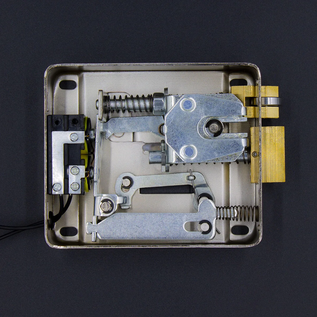Разблокировка двери может быть осуществлена как с кнопки на замке так и с помощью только с помощью соленоида: на соленоид поступает напряжение, приводя тем самым в действие сброс фиксатора пружины, которая втягивает в корпус замка запорный ригель. Таким образом дверь остаётся разблокированной до её закрытия.
