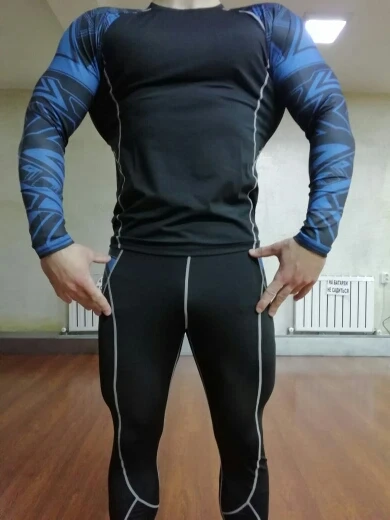 Костюм для мужчинПрименимые сцены: тренажерный зал, Велоспорт, бег, Фитнес Спорт на открытом воздухе, ММА мужской Рашгард и так далееПожалуйста, учитывайте разницу в 1-2 см из-за ручного измерения из-за различных условий отображения и освещения. Цвета могут немного отличаться от тех, которые показаны на фотографиях.Особенности1. Дышащая спортивная ткань, четыре иглы и шесть линий, высокая эластичность и герметичность2. Быстро впитывает пот, быстро испаряется и можно носить удобно и стильно3. Эластичная ткань, быстросохнущая и дышащая4. Растяжка в четырех размерах, без ограничений