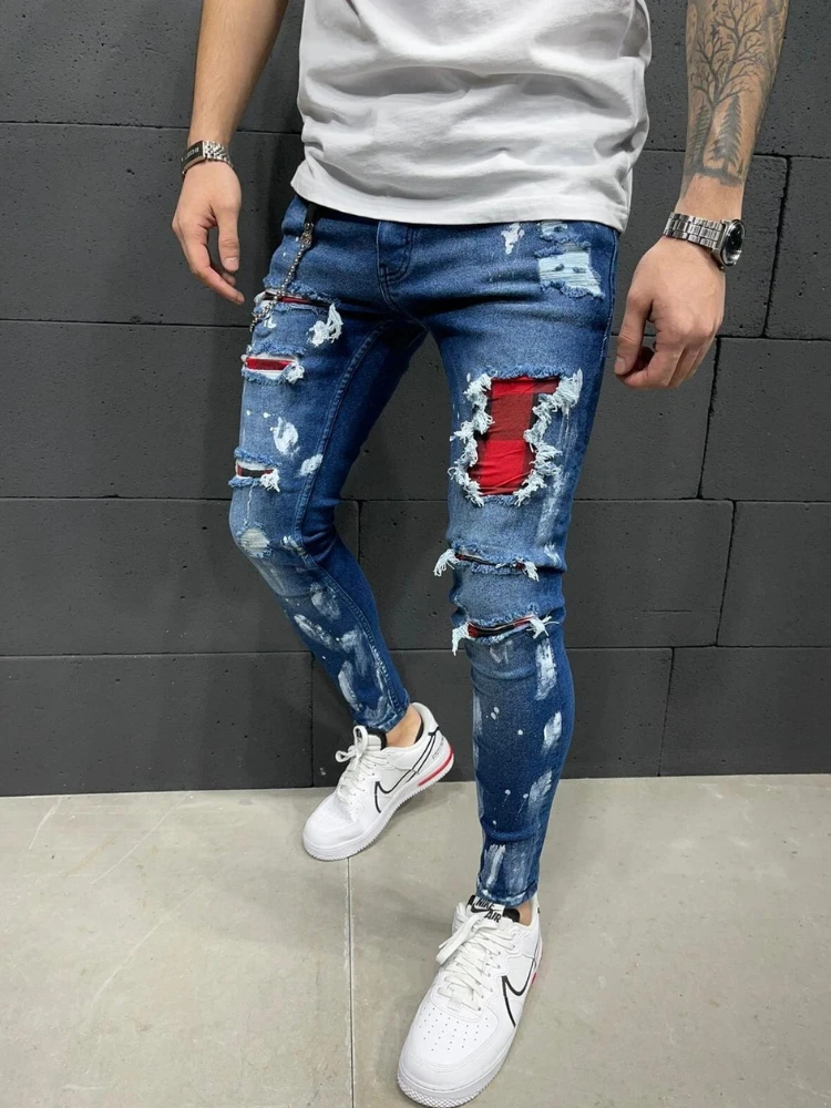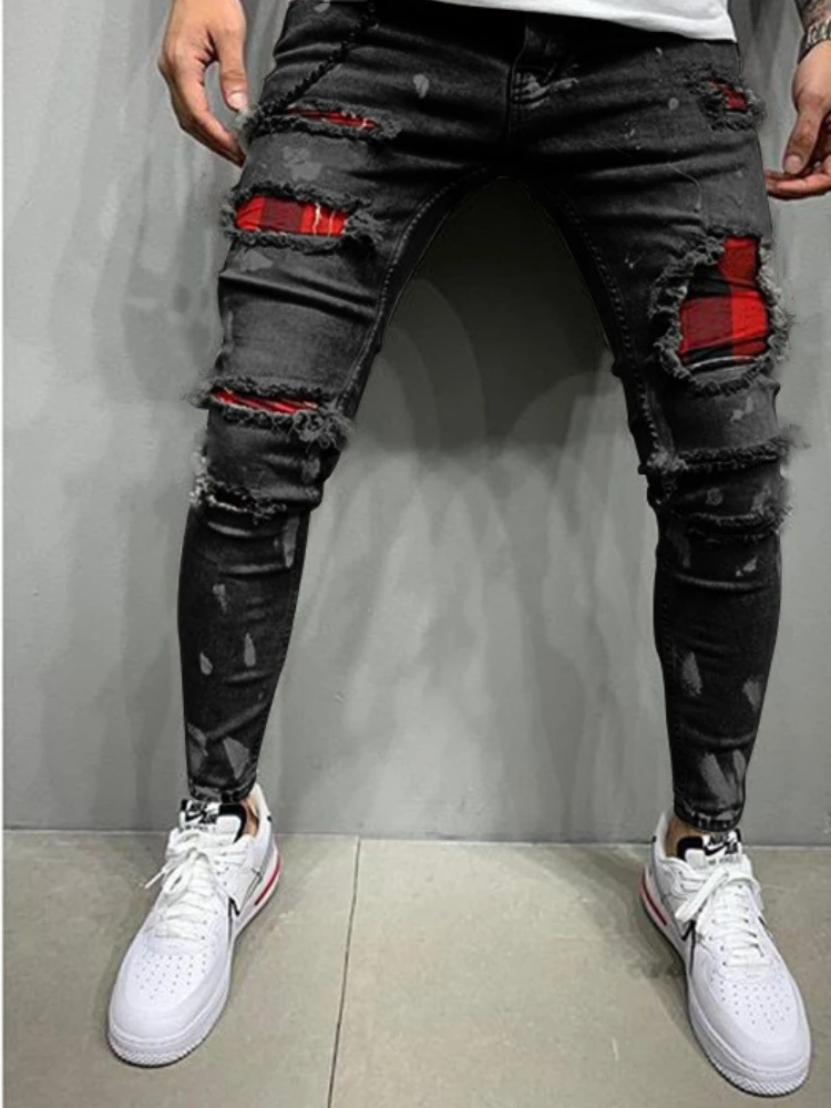 Мужские Стеганые джинсы с вышивкой, узкие джинсы, рваные джинсы стрейч в клетку, мужские брюки с эластичным поясом, пэчворк, джинсовые брюки для бега