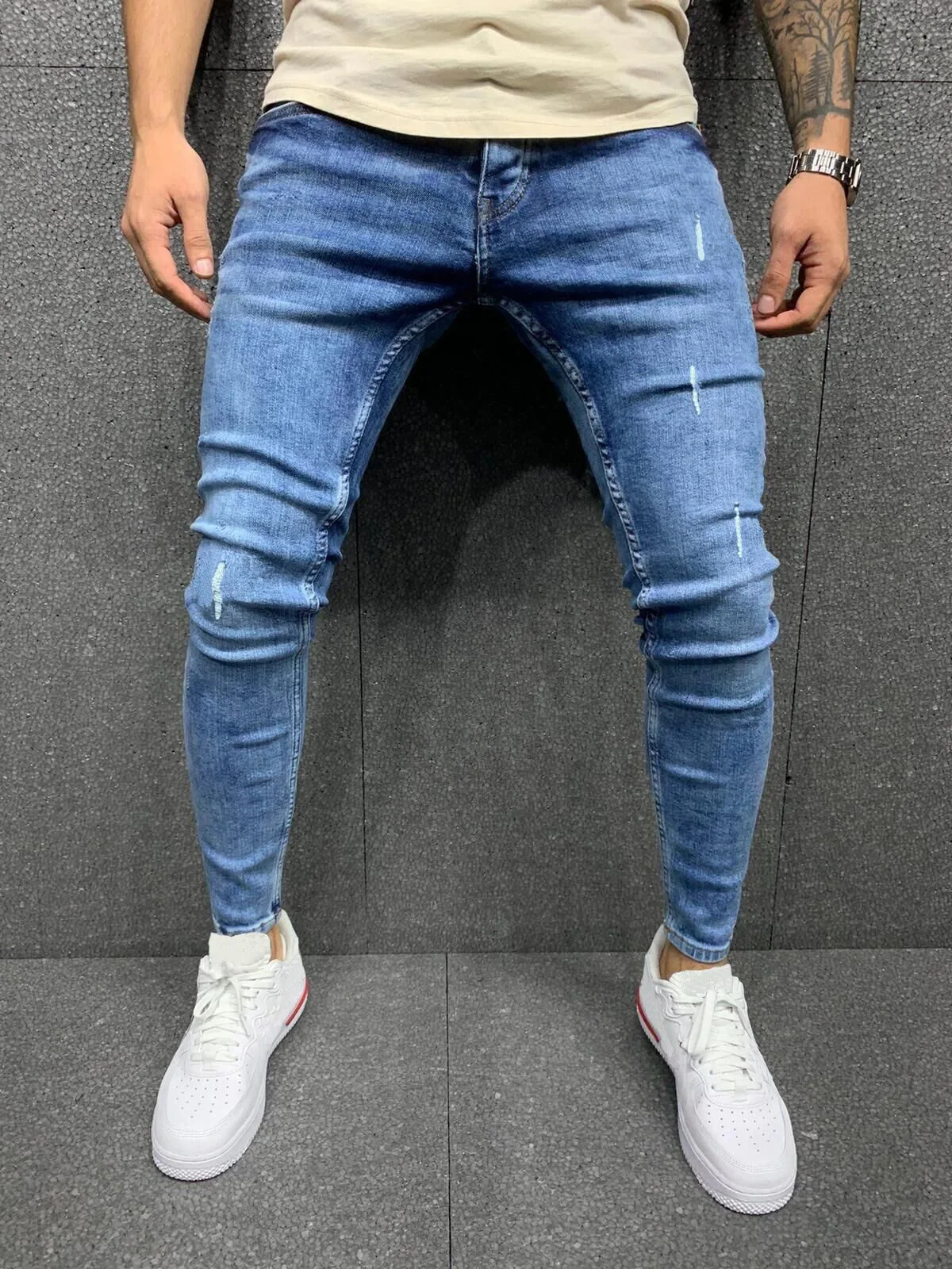 Джинсы мужские зауженные однотонные, велосипедные брюки-карандаш, потертые, Классическая деловая уличная одежда, синие
