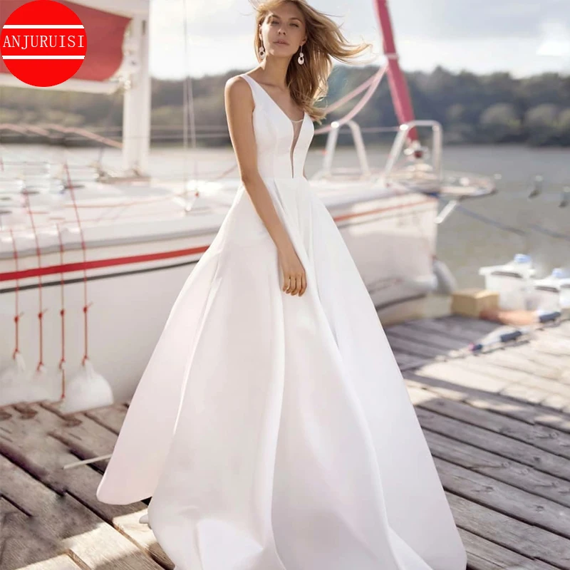 Женское свадебное платье без рукавов, Белое Атласное Платье с v-обр...