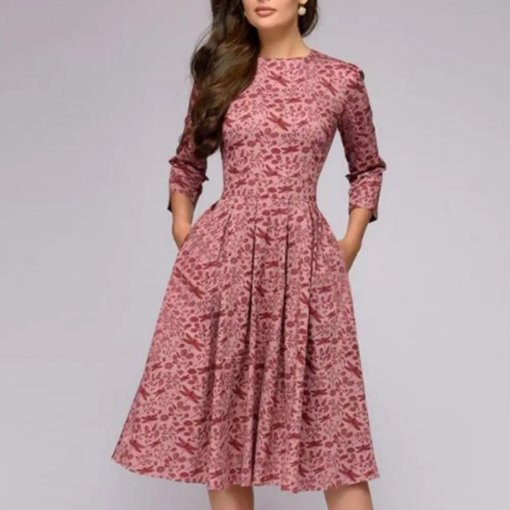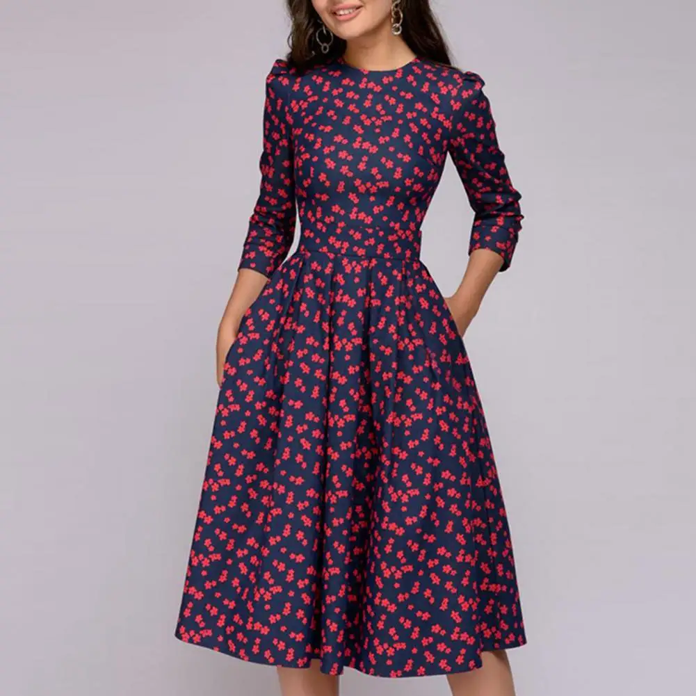 Облегающее рождественское платье с круглым вырезом и рукавом 34, плиссированное платье миди с широким подолом и цветочным принтом, уличная одежда для женщин 2021