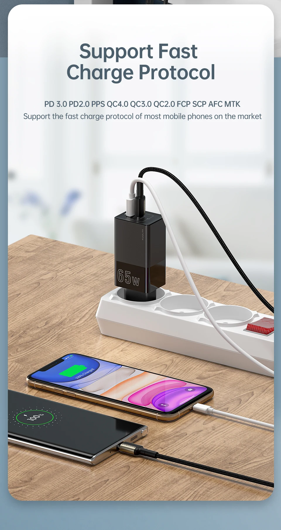 Быстрая зарядка 65 Вт● Высокая мощность 65 Вт● Защита безопасности● Протокол быстрой зарядки с интеллектуальным распознаванием● Меньший размер