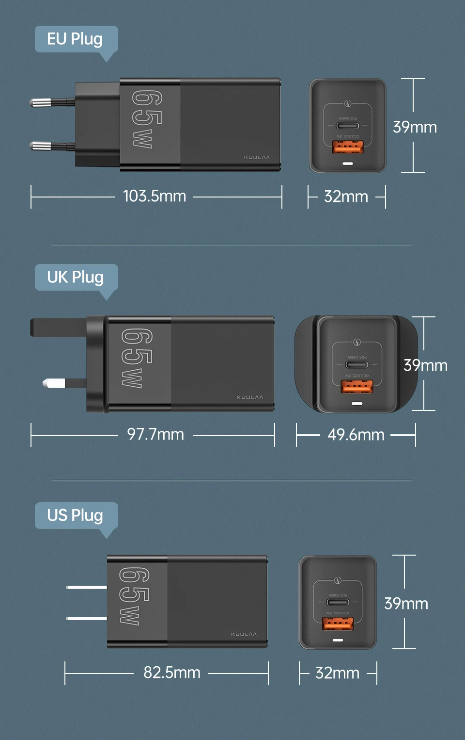 Бренд: KUULAAНазвание продукта: 65W GaN зарядное устройствоВход: AC 100-240V 50 / 60Hz 1.5AОбщая выходная мощность: 65 Вт (макс.)Материал: PC + ABSРазмер: 66*32*39 ммВес: 108 г