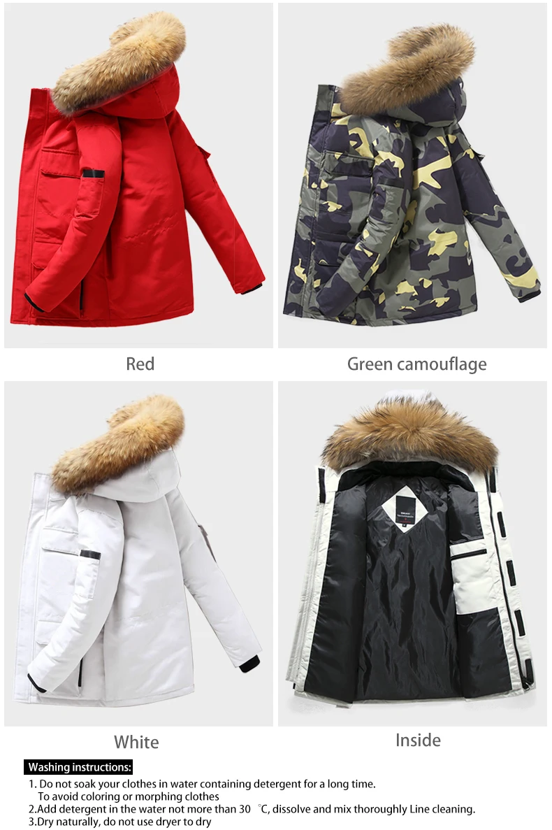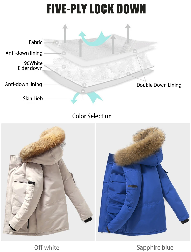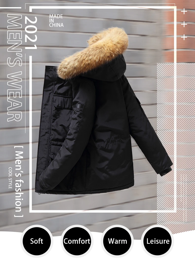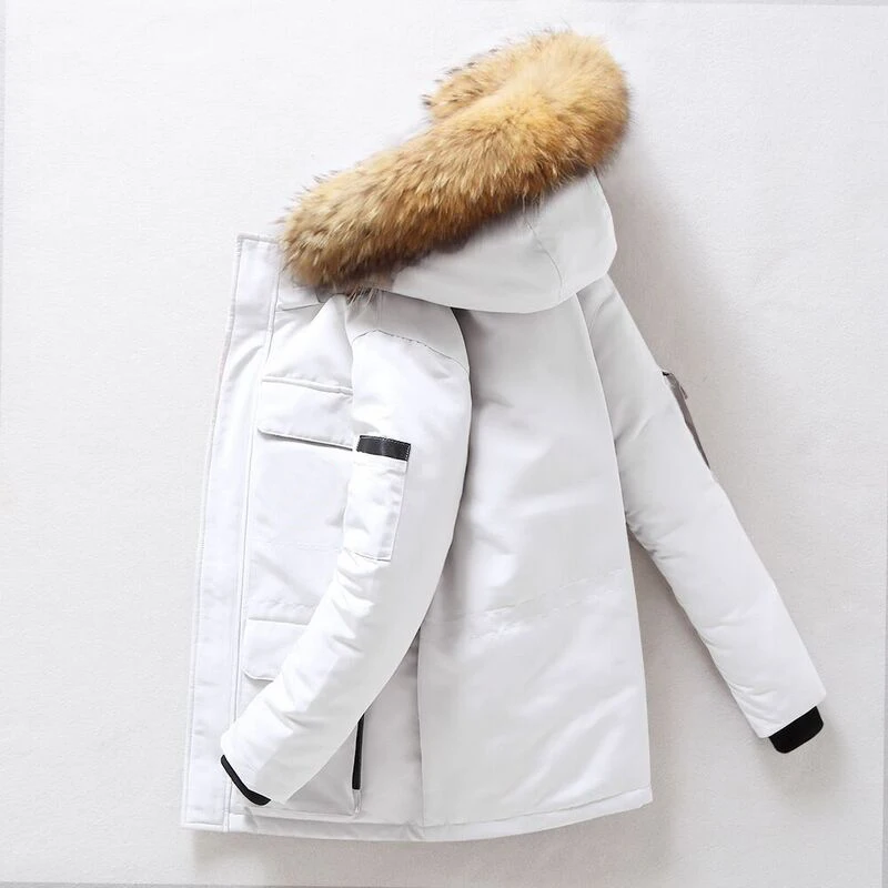Мужская зимняя куртка на белом утином пуху с капюшоном и меховым воротником