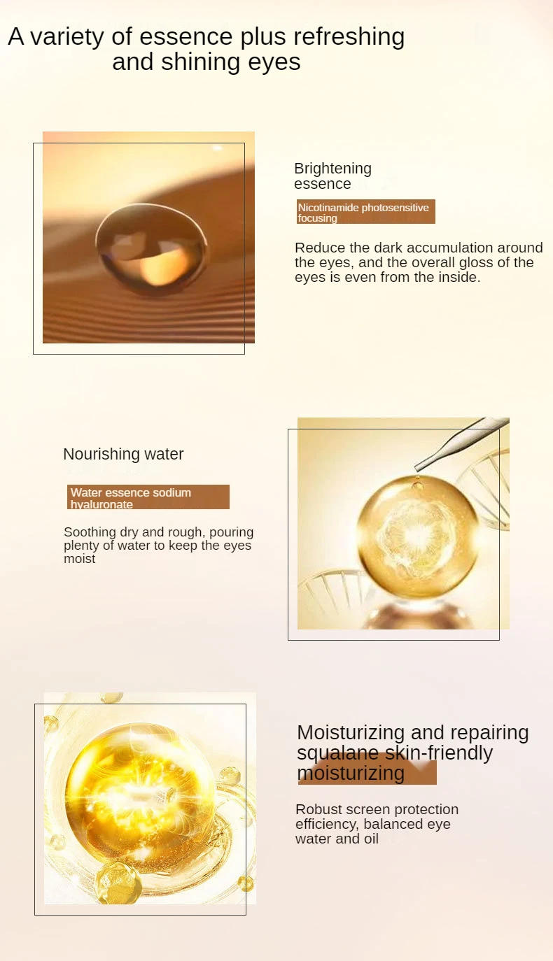 1. Осветляющая эссенцияСветильник sensation focus от nicotinamideУменьшает тусклую кожу вокруг глаз и равномерно осветляет глаза изнутри и общую привлекательность2. Увлажняет и питаетГиалуронат натрия водной эссенцииУспокаивает сухую и грубую кожу, заливает достаточную влагу и поддерживает ощущение Гидры вокруг глаз3. Увлажняет и восстанавливает усталость, сохраняет кожу чистой и питательнойСтабильно защищает даже влагу и масло для кожи вокруг глаз