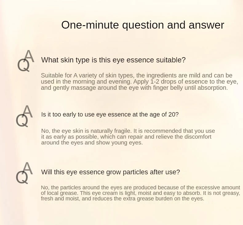 ★В: какая группа подходит для эссенции глаз?О: подходит для нескольких типов кожи. Его ингредиенты мокрые, их можно применять утром и вечером. Возьмите от 1 до 2 точек эссенции и нанесите на кожу вокруг глаз. Массируйте вокруг глаз до полного впитывания.★Вопрос: слишком ли рано применять его, когда вам всего 20 лет?О: Нет, не будет. Кожа вокруг глаз очень слабая. Мы предлагаем вам использовать его раньше. Это будет лучше для ваших глаз. Продукт может успокоить дискомат вокруг глаз и подарить молодость гламура.★В: будет ли эссенция для глаз создавать гранулы?О: конечно нет. Гранулы появляются из-за появления чрезмерной смазки. Крем для глаз имеет светильник, питательную и легко рассасывающуюся текстуру. Он не жирный или жирный и может сделать кожу вокруг глаз чистой и питательной. Это может уменьшить дополнительную нагрузку на смазку для глаз.