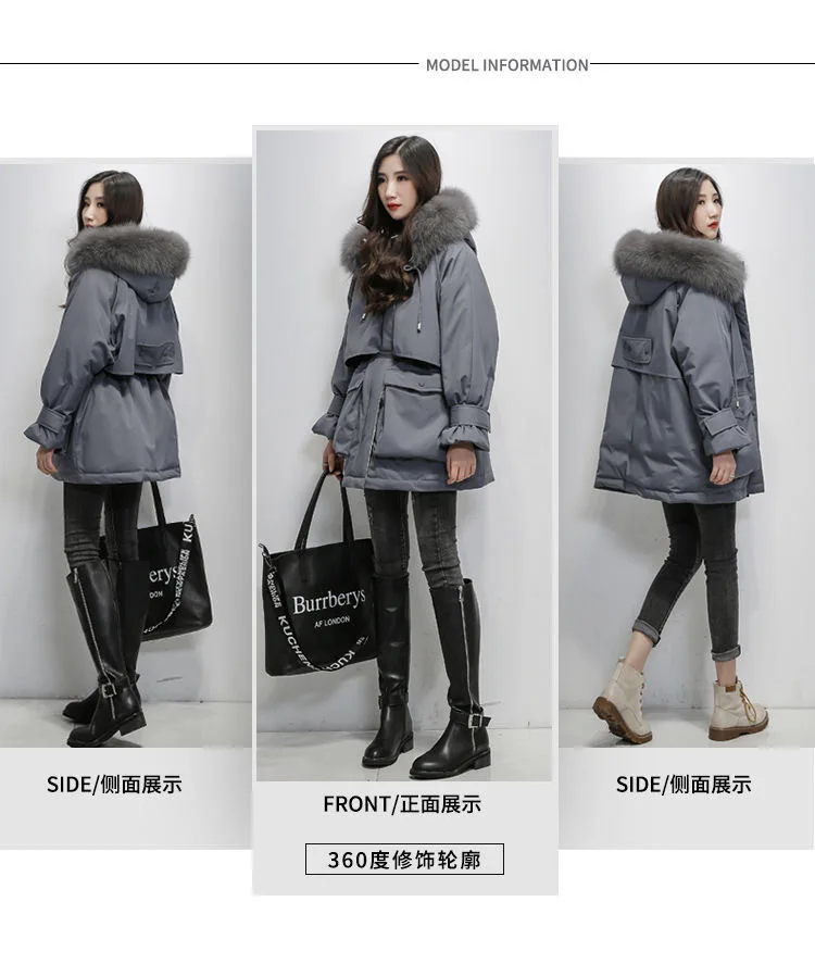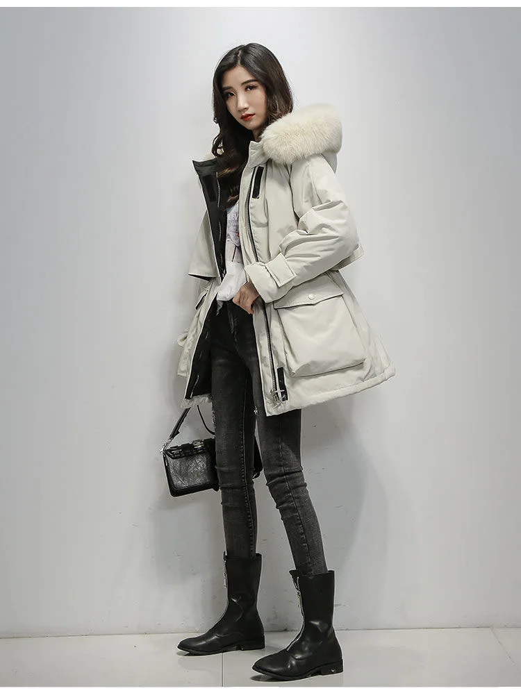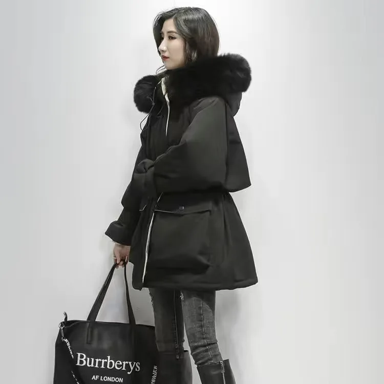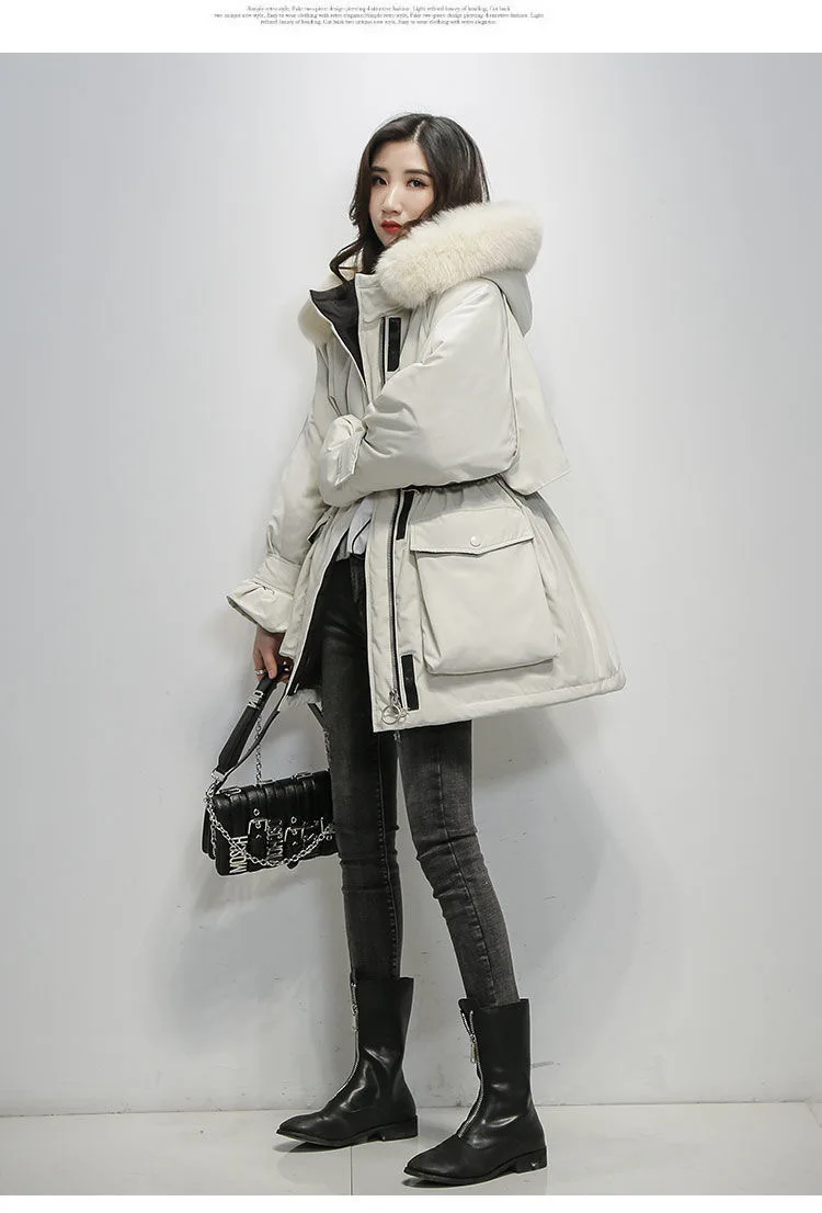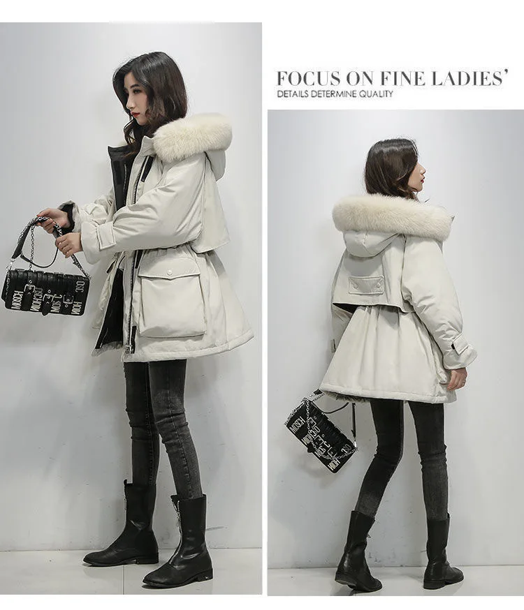 Большая зимняя женская куртка с капюшоном из натурального Лисьего меха, толстые парки на 90% белом утином пуху, теплое зимнее пальто с поясом и завязкой