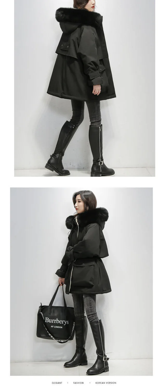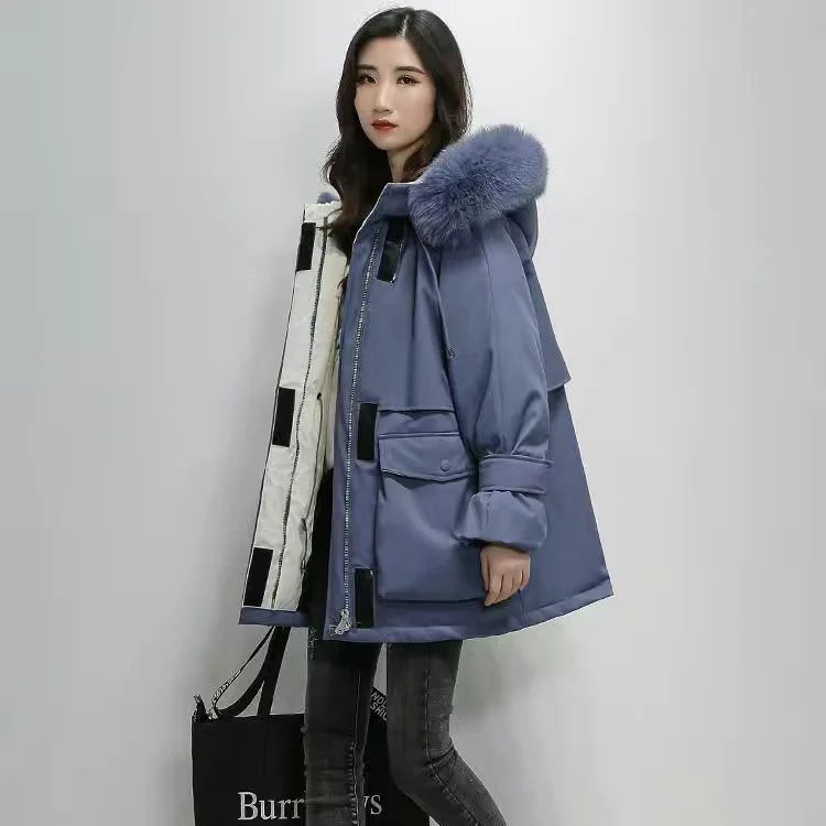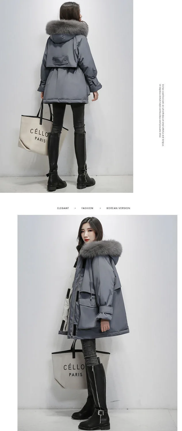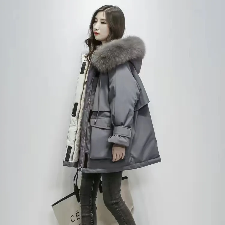 Большая зимняя женская куртка с капюшоном из натурального Лисьего меха, толстые парки на 90% белом утином пуху, теплое зимнее пальто с поясом и завязкой