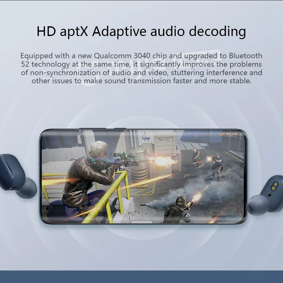 Совершенно новый чип Qualcomm 3040 одновременно обновлен до технологии Bluetooth 52, что может значительно улучшить такие проблемы, как асинхронный звук и изображение, помех и т. д. Чтобы сделать передачу звука более быстрой и стабильной. Поддержка адаптивного декодирования аудио aptx, установка высокого качества звука и низкая задержка в одном