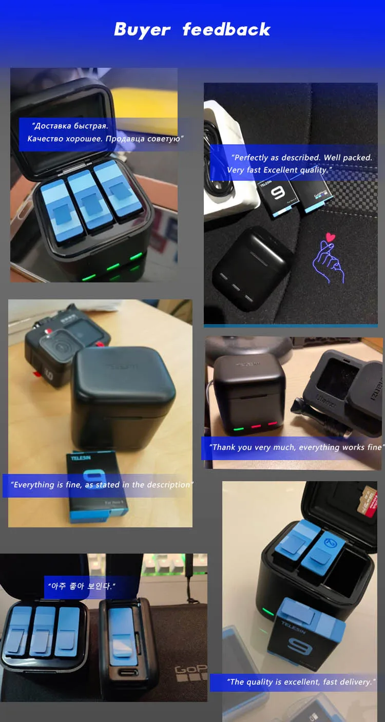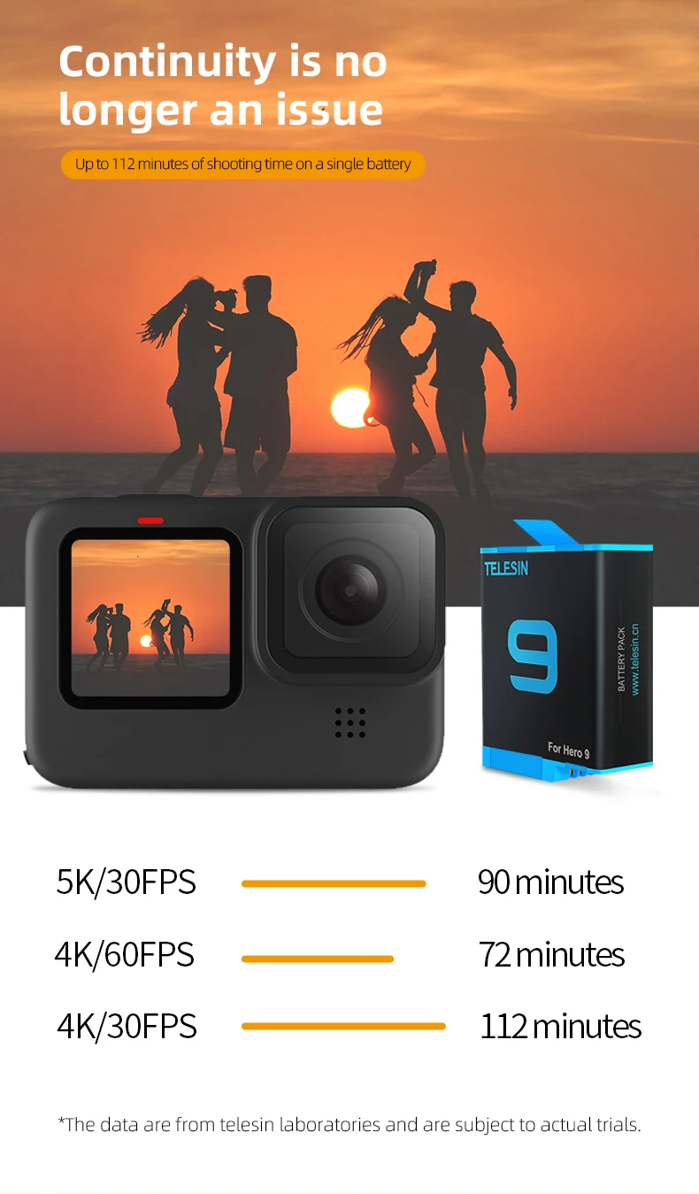 1.100% подходит для GoPro Hero 9,Hero 10 black2. 2. Полностью декодированный, без всплывающих окон. 3.1750 мАч реальная емкость, больше, чем Оригинальная батарея. 4. До 112 минут времени съемки на одной батарее. (Это данные лабораторного тестирования TELESIN, и значение варьируется в зависимости от различных режимов съемки и окружающей среды)