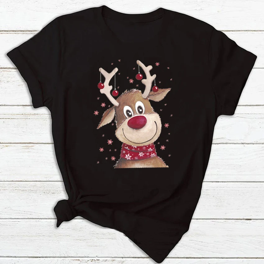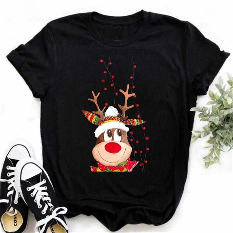 Забавная мультяшная черная футболка с принтом Санта-оленей, модные женские топы, футболка для женщин, рождественские праздничные футболки для женщин