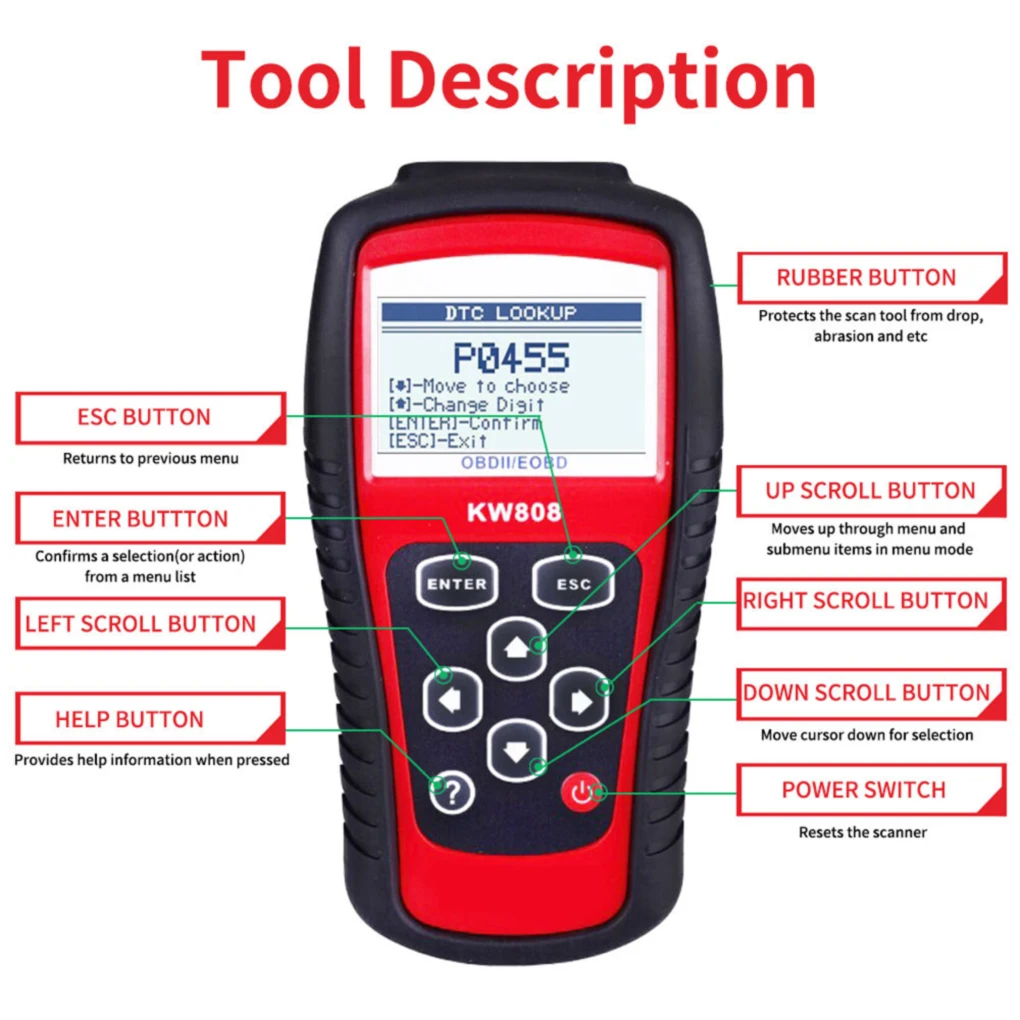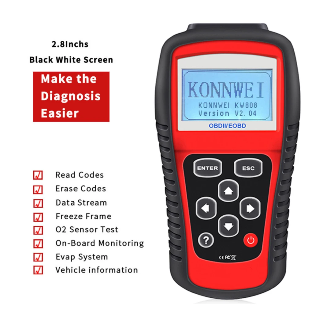 Описание:Считыватель кодов KW808 OBDII/EOBD поддерживает все 9 режимов тестирования OBDII на всех транспортных средствах, совместимых с OBDII EOBD, чтобы техники и домашние пользователи могли точно диагностировать даже самые сложные проблемы.Этот сложный и простой в использовании ручной инструмент сканирования обеспечивает быстрый и легкий доступ к кодам неисправностей EOBD на базе двигателя.Инструмент с поддержкой Can обеспечивает четкие и лаконичные определения DTC на большом ЖК-экране с подсветкой, может получить общие коды P0, P2, P3 и U0 для выбросов двигателя, А также получить коды от производителя P1, P3 и U1 и выключить светильник MIL, хранить данные о замораживании для более поздней оценки, Также будет отображаться Обнаружение и состояние готовности I/M.Сканер KW808 считывает поток данных PCM в режиме реального времени, отображает данные тестирования датчика кислорода в реальном времени, семь языков: английский, французский, немецкий, голландский, испанский, португальский, русский.Сканер KW850 ODB2 подходит для всех американских, европейских и азиатских транспортных средств, которые соответствуют OBDII в 1996 году и позже, и используется для проверки общих неисправностей автомобиля.