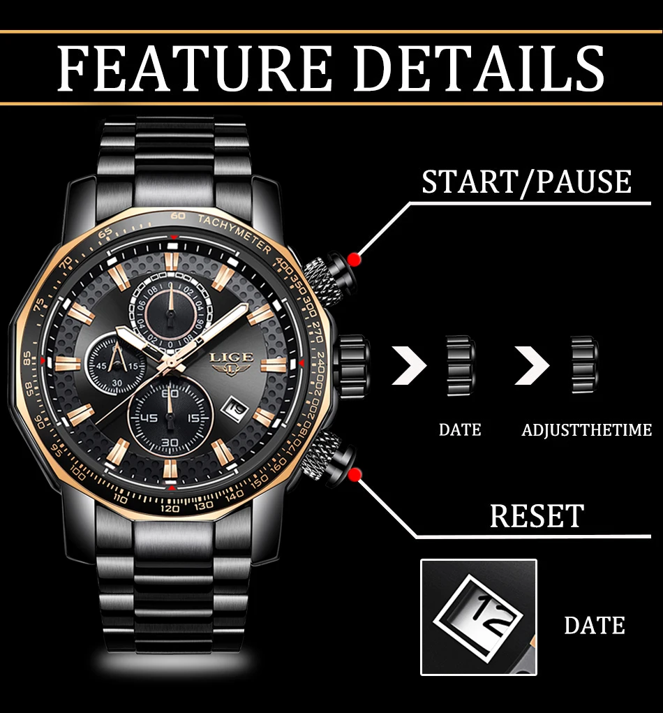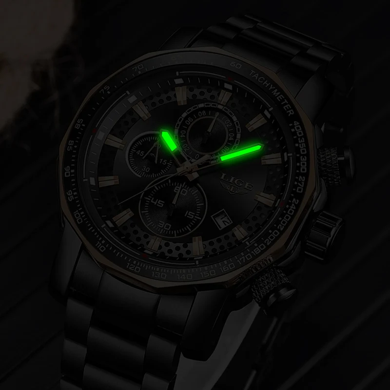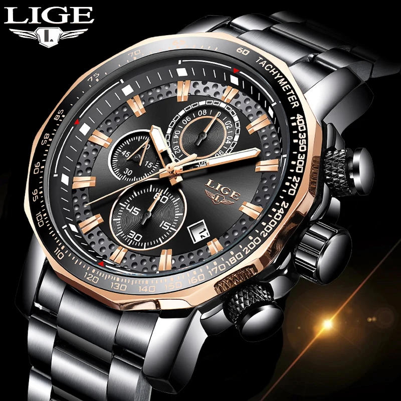 Часы наручные LIGE мужские с большим циферблатом, модные брендовые Роскошные спортивные водонепроницаемые кварцевые с хронографом, с датой