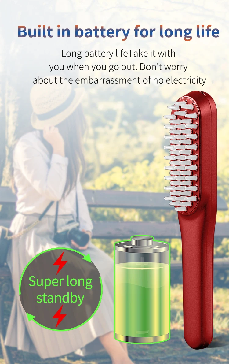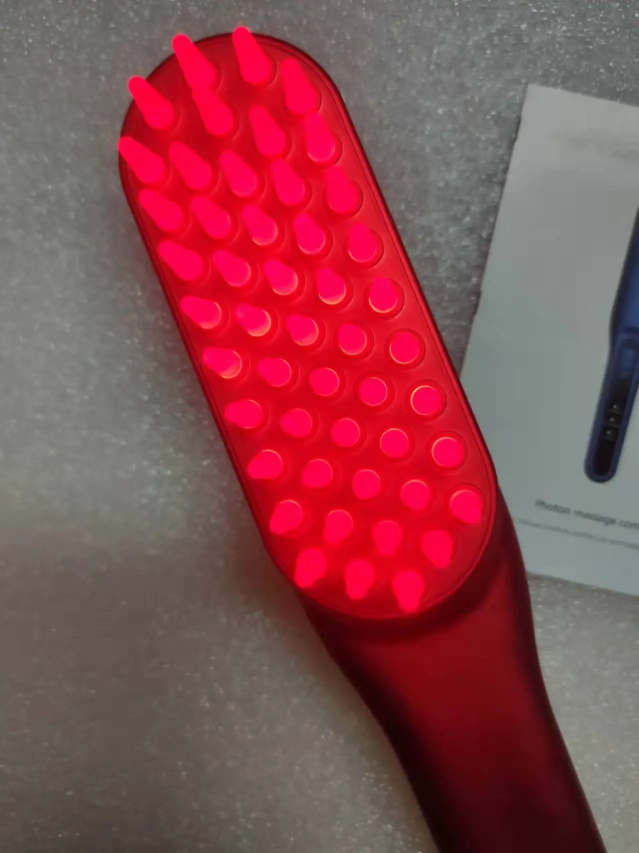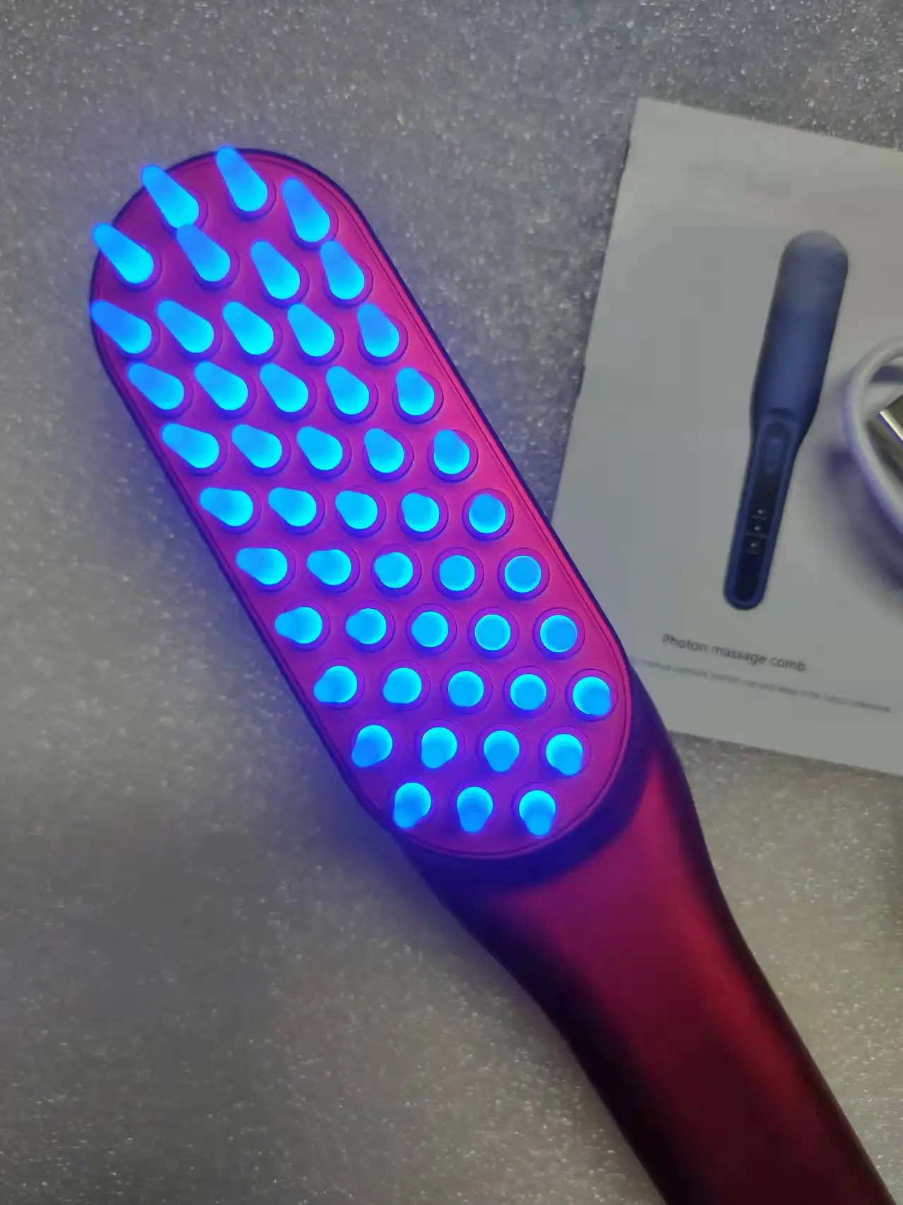Отличное качество гребня. Вы можете использовать красный, синий и массажные функции отдельно. Нажмите кнопку питания около 5 секунд, чтобы включить массажную расческу.