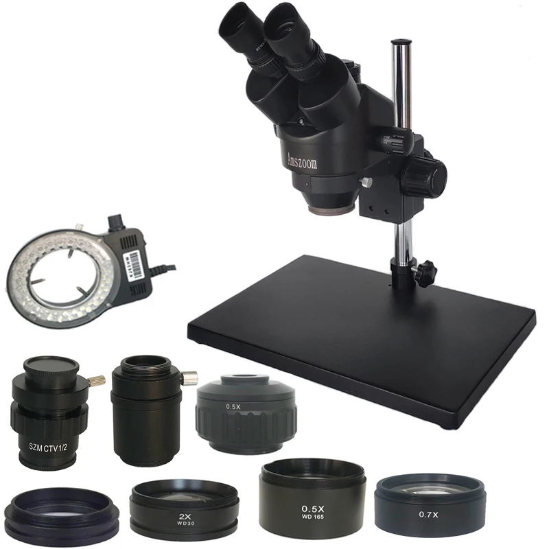 1 x пара супер Widefield 10X окуляров1x56-светодиодный кольцевой светильник с адаптером селфи-Стик1 x столешница большого размера1 x стойка для фокусировки1 пара защитных очковПылезащитный чехол-1 шт.1x 0.5X объектив (для 3.5X -90X)