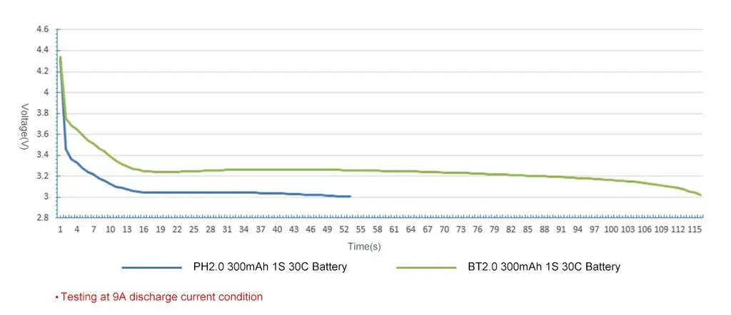Разъем BT2.0Существует диаграмма сравнения между соединителем BT2.0 и разъемом PH2.0 (твердые штыри) в батарее BETAFPV 1S 300mAh. Ток разряда 9A в этом тестировании. Вы можете увидеть, что у него есть двойное Отображение времени (около 2 минут), а также 0,2 v улучшение напряжение провисания с BT2.0 разъем.