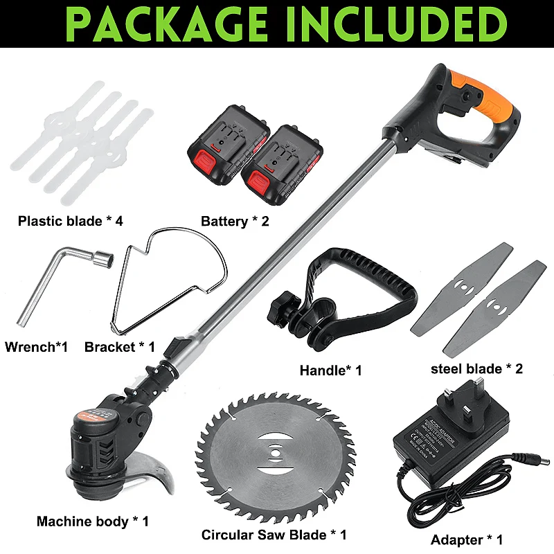 Посылка:1 х беспроводной триммер для газонов1 или 2 x литий-ионный аккумуляторЗарядное устройство-1 шт.5 x пластиковая режущая головка1 x легированная пила2 лезвия из сплава1 гаечный ключ