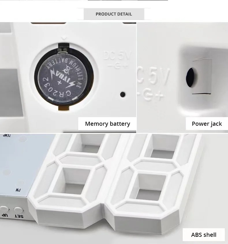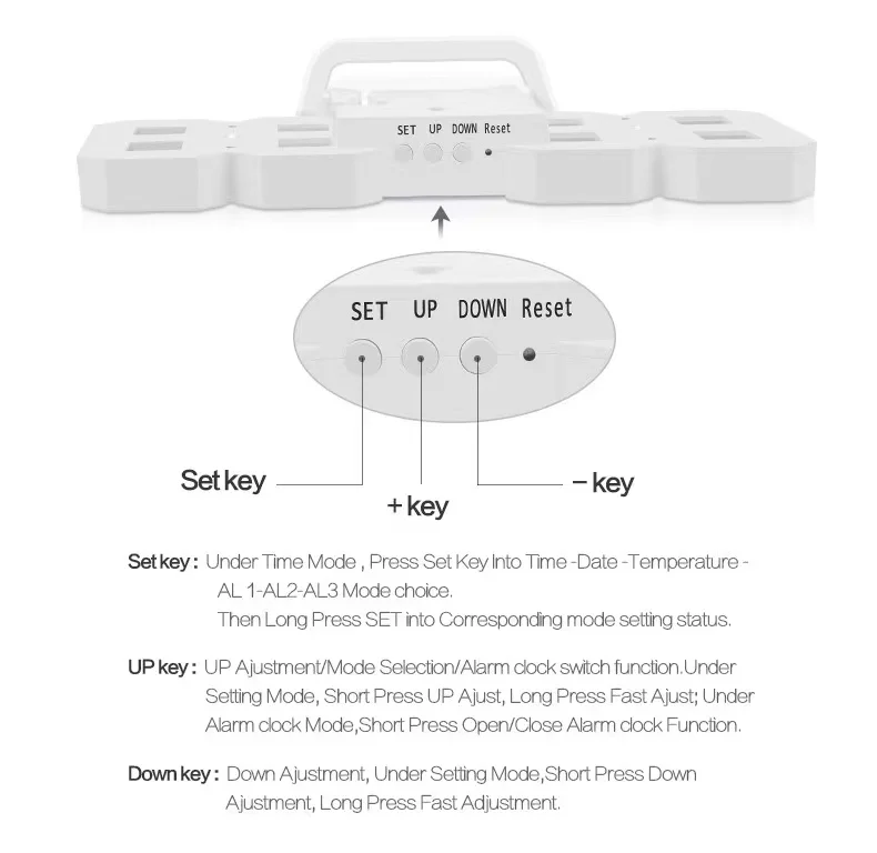 Материал: АБС-пластикРазмеры: 22,5*8 см4 кнопки управления: Настройка сбросаПитание: USB кабель/3 * AAA батареи (не входят в комплект)
