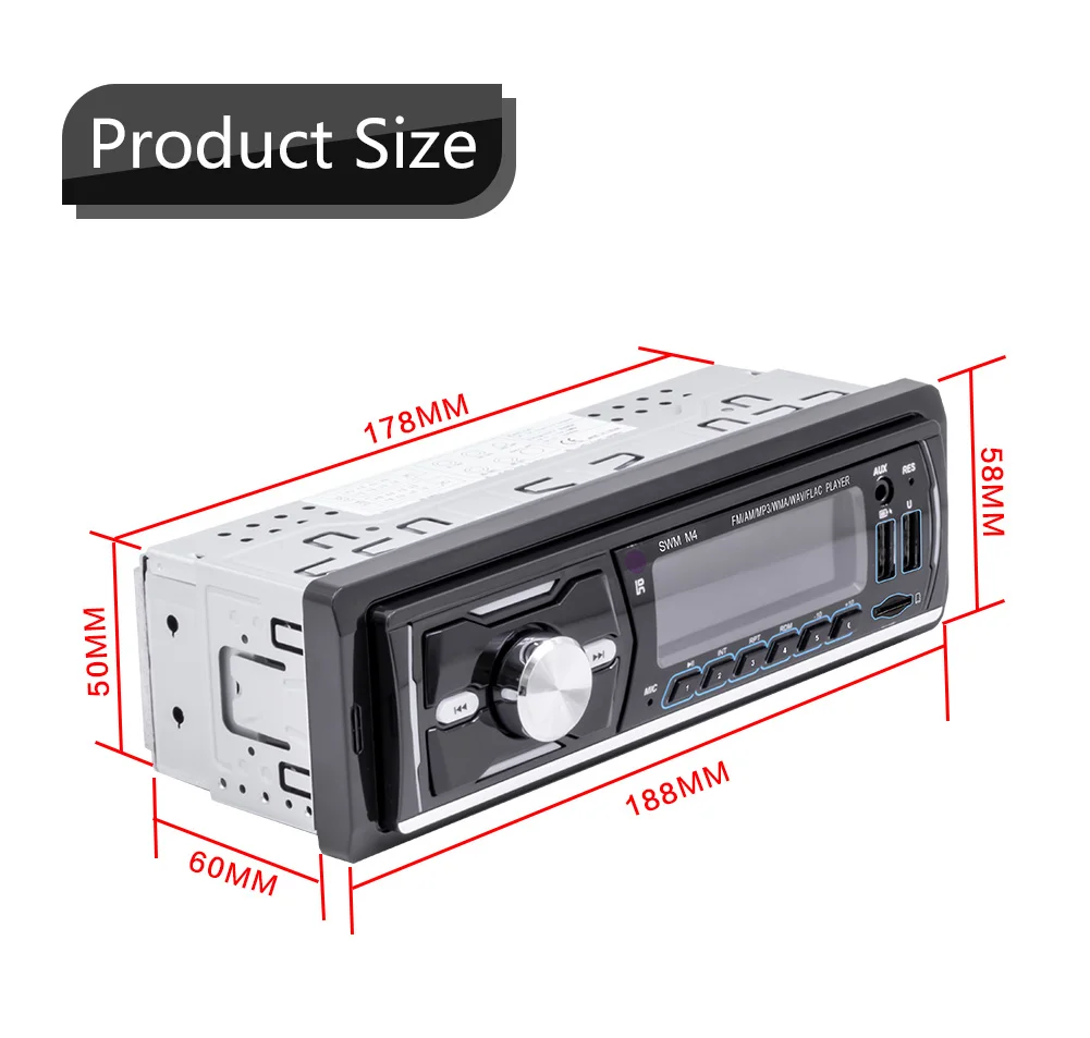 Напряжение: DC12VРазмер установки: 188*58*60 мм (7,4*2,28*2,36 дюймов)Мощность: 60 Вт * 4Модель Bluetooth: 4,0Чип усилителя мощности: TDA7388Радио: fm87,5-108 МГц/AM522-1620KHzСлот для карты: TF картаИнтерфейс USB: 2 * USB2.0, один для чтения и другой для зарядки 5V1AПоддерживаемый Формат аудио: MP3/WMA/WAV/FLACRCA терминал: 4 выхода RCA (красный/белый разъем лотоса)