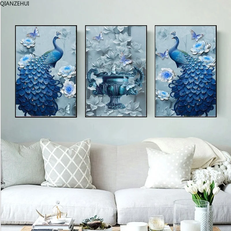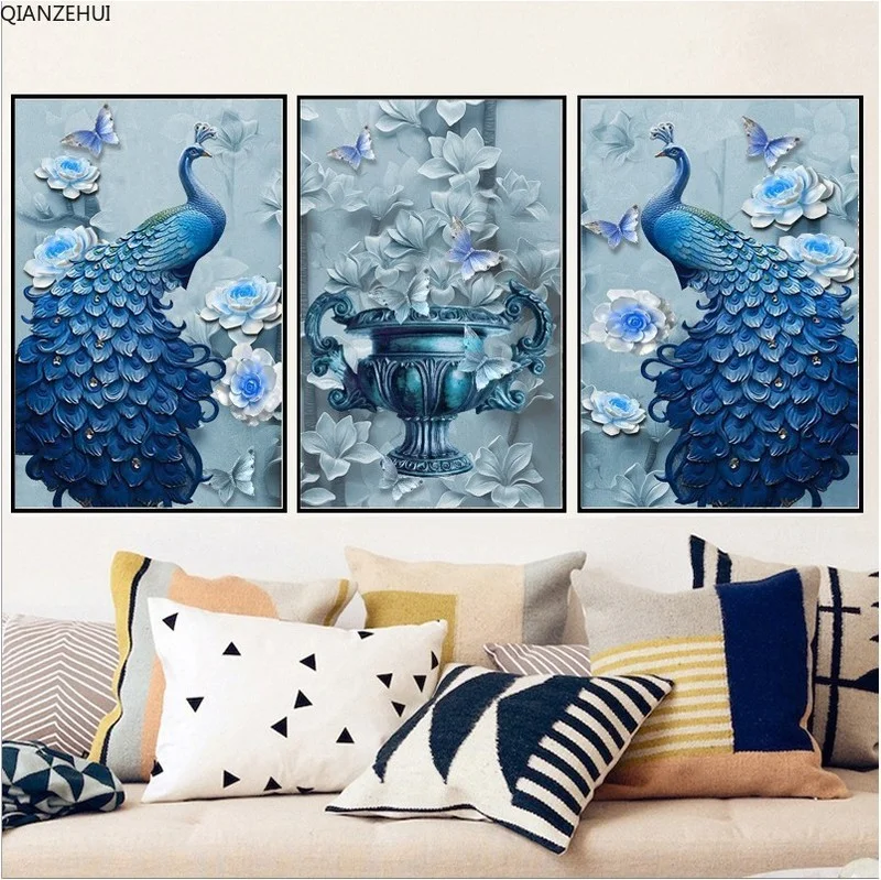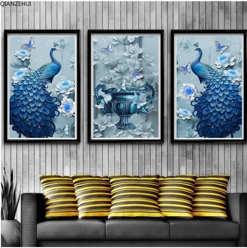 QIANZEHUI, алмазная 5D Вышивка своими руками, круглые алмазы, три павлина, полная Стразы 5D алмазная живопись, вышивка крестиком
