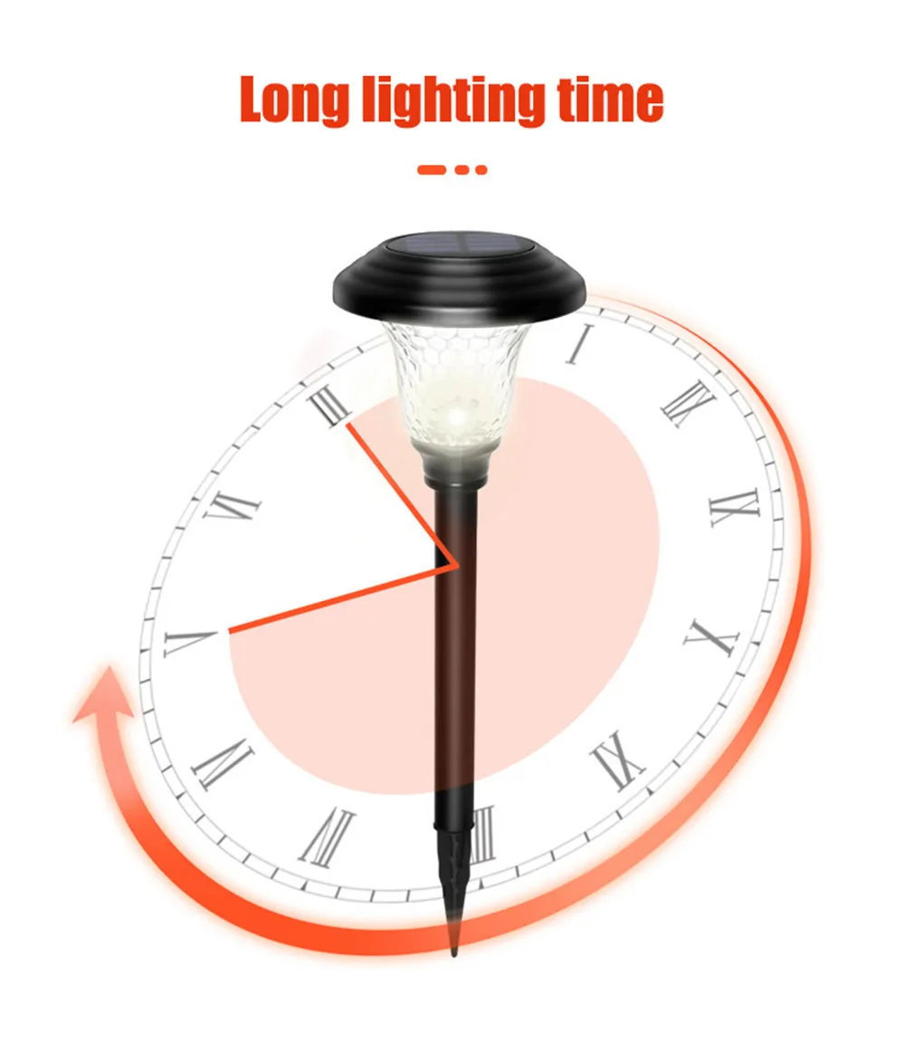 Продолжительное время использования. Солнечная панель преобразует Солнечный свет в дневное время и заряжает батарею. Ночью светильник включается автоматически. Светильник в сборе, секции кола, разъемы и прочные заземляющие шипы включены. Это энергоэффективное, низкое обслуживание солнечных ламп добавить очаровательное, декоративное свечение к вашей подъездной дорожке, патио или клумбах.