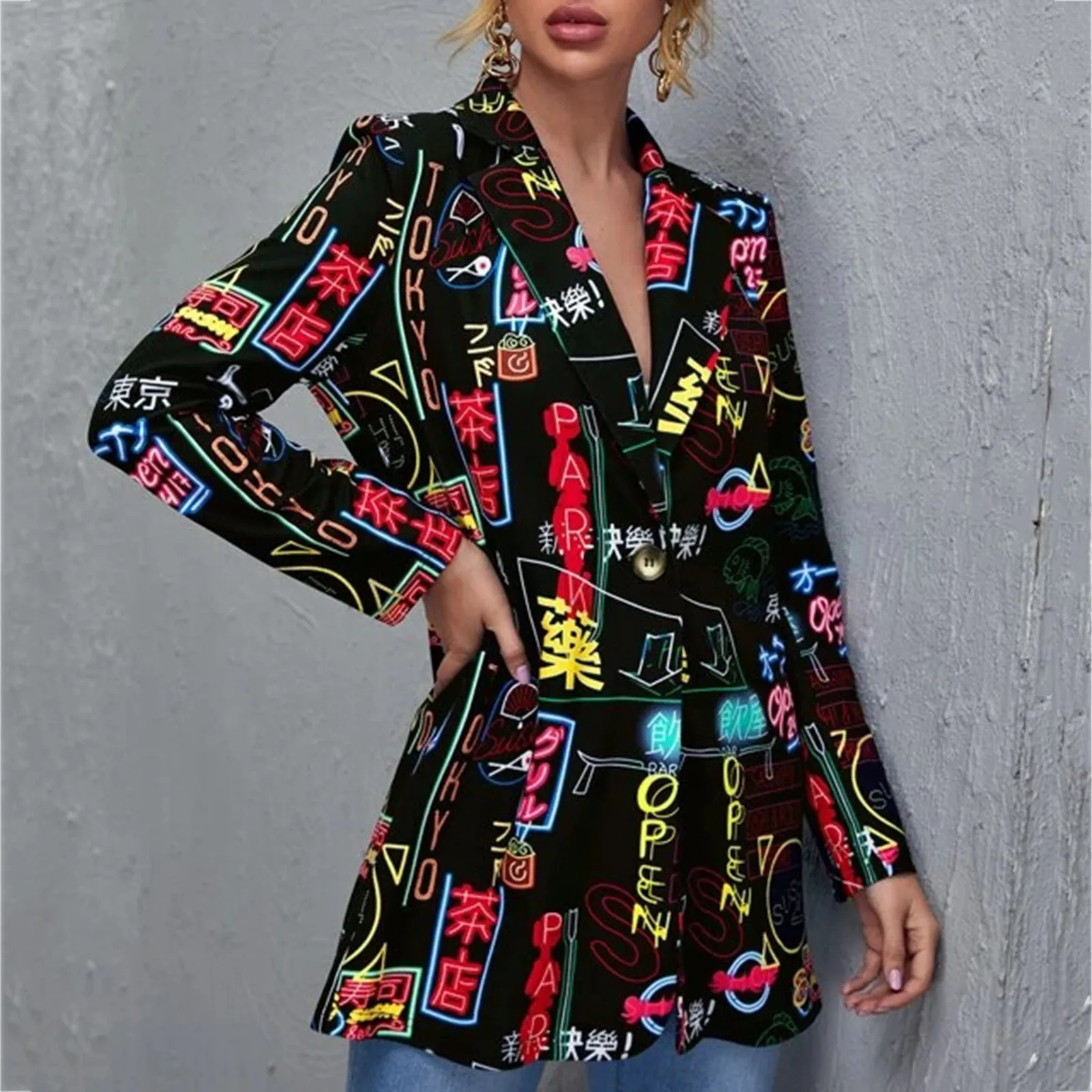 Женский офисный пиджак с отложным воротником, элегантный винтажный повседневный жакет с длинными рукавами и принтом в стиле хип-хоп, уличная одежда, осень-зима