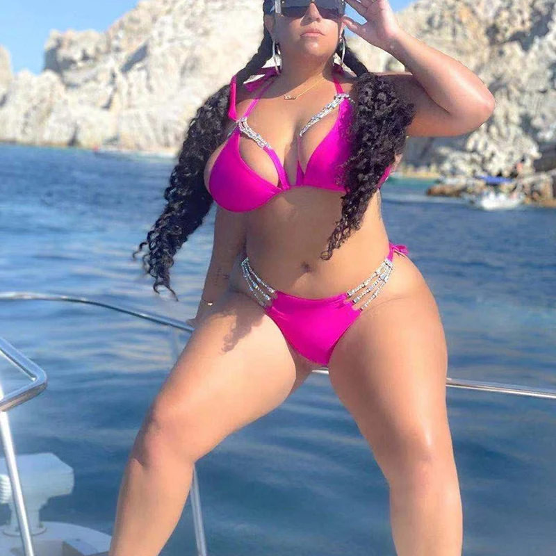 Однотонный Соблазнительный комплект бикини со стразами и цепочкой, треугольный купальник, женский купальный костюм с лямкой на шее, комплект бикини, женские купальные костюмы для женщин