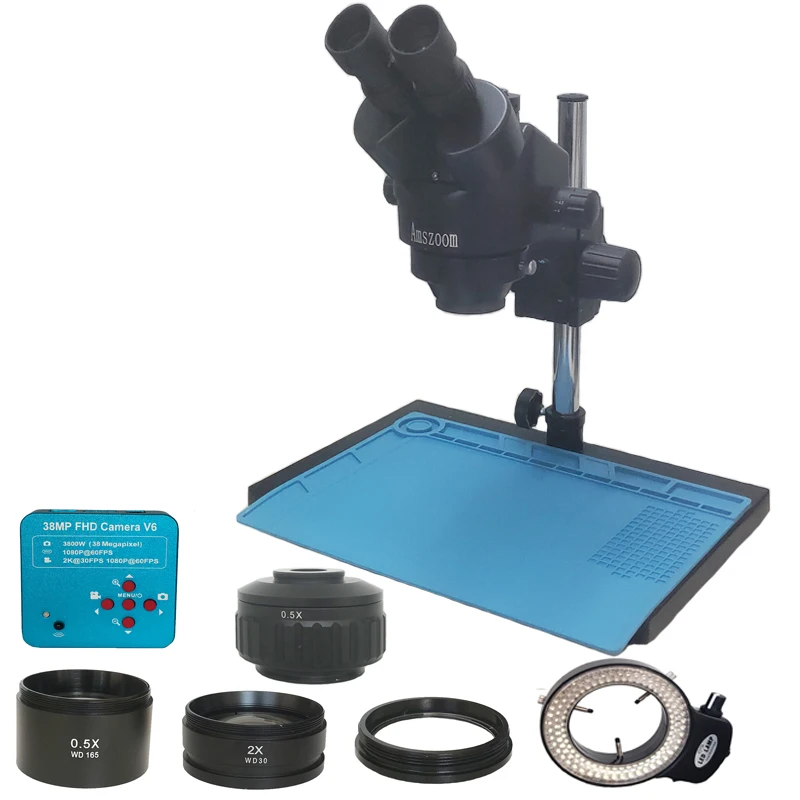 1x144-светодиодный кольцевой светильник с адаптером1 x столешница большого размера1 x стойка для фокусировки1 пара защитных очковПылезащитный чехол-1 шт.1 объектив 0,5x1 объектив 2.0X