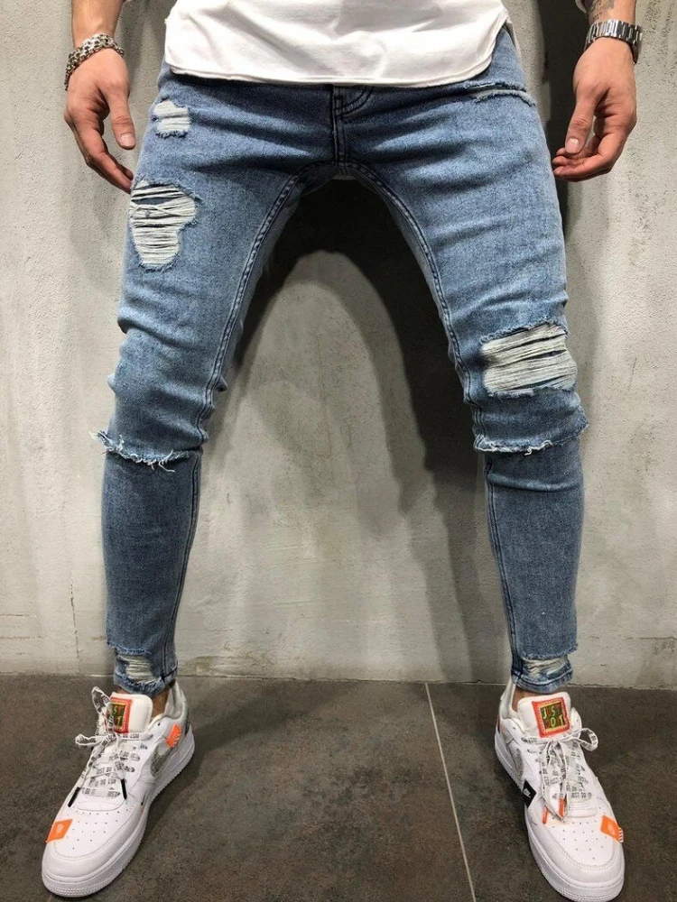 Рваные узкие джинсы, мужские синие брюки-карандаш, мужские облегающие байкерские джинсовые брюки, повседневные брюки для отпуска в стиле панк с дырками