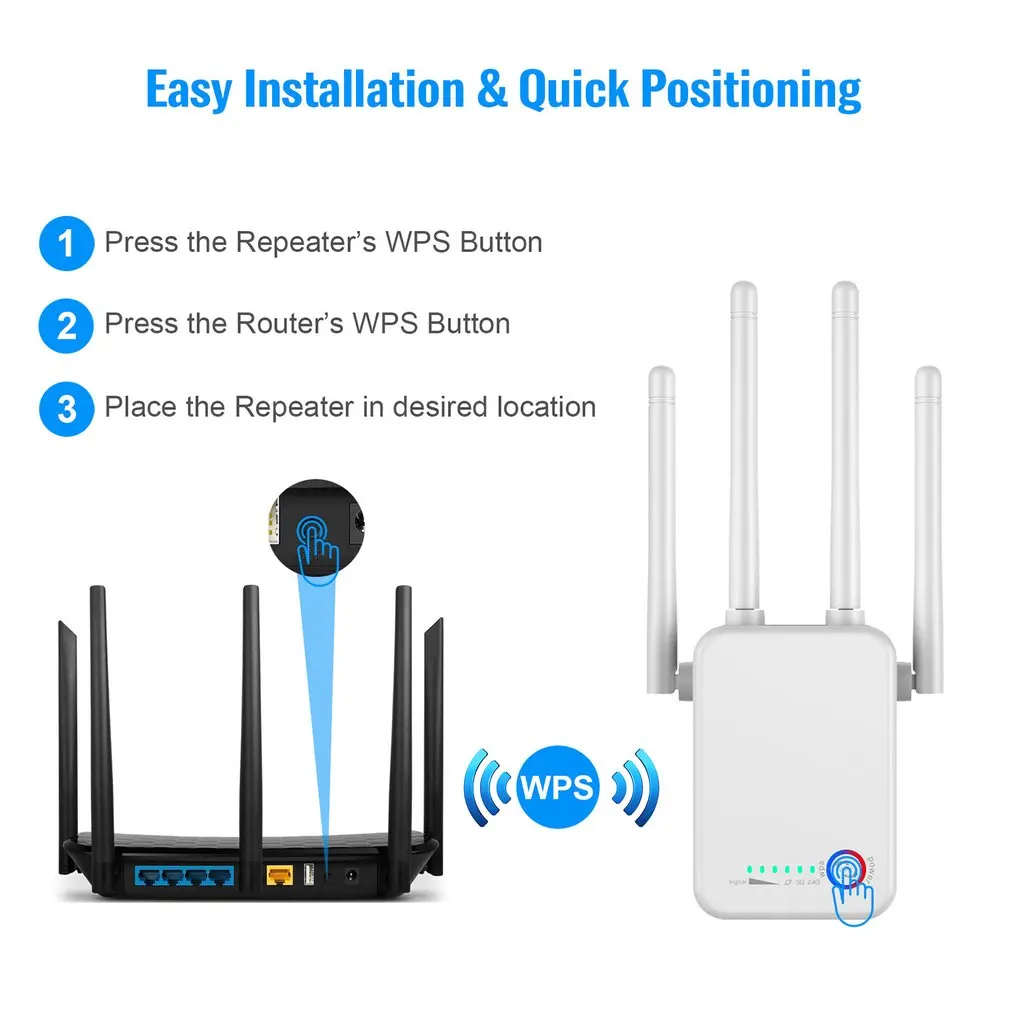 4. Настройка одной кнопки. Функция настройки одной кнопки легко интегрирует Ретранслятор с текущими сетями без каких-либо перерывов. Подключите беспроводной Интернет-удлинитель к розетке, затем нажмите кнопку wps в течение 60 секунд, нажмите кнопку wps на вашем маршрутизаторе, подождите, пока ваш расширитель успешно подключится к сети Wi-Fi вашего маршрутизатора.